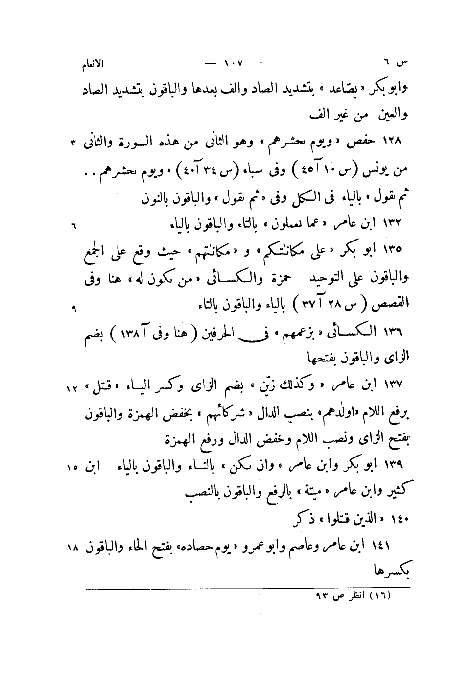 حَفْص {وَيَوْم يحشرهم} وَهُوَ الثَّانِي من هَذِه السُّورَة وَالثَّانِي من يُونُس وَفِي سباء ( {وَيَوْم يحشرهم} ... . {ثمَّ يَقُول} ) بِالْيَاءِ فِي الْكل وَفِي {ثمَّ نقُول} وَالْبَاقُونَ بالنُّون