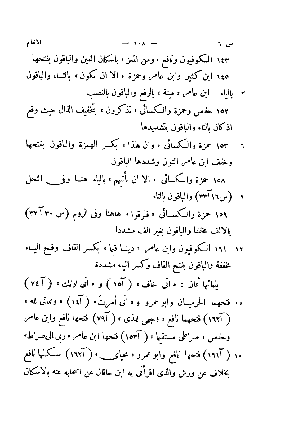 ياءاتها ثَمَان {إِنِّي أَخَاف} و {إِنِّي أَرَاك} فتحهما الحرميان وابو عَمْرو {إِنِّي أمرت} {ومماتي لله} فتحهما نَافِع {وَجْهي للَّذي} فتحهَا نَافِع وَابْن عَامر وَحَفْص {صِرَاطِي مُسْتَقِيمًا} فتحهَا ابْن عَامر {رَبِّي إِلَى صِرَاط} فتحهَا نَافِع وابو عَمْرو {ومحياي} سكنها نَافِع بِخِلَاف عَن ورش وَالَّذِي اقرأني بِهِ ابْن خاقَان عَن اصحابه عَنهُ بالاسكان