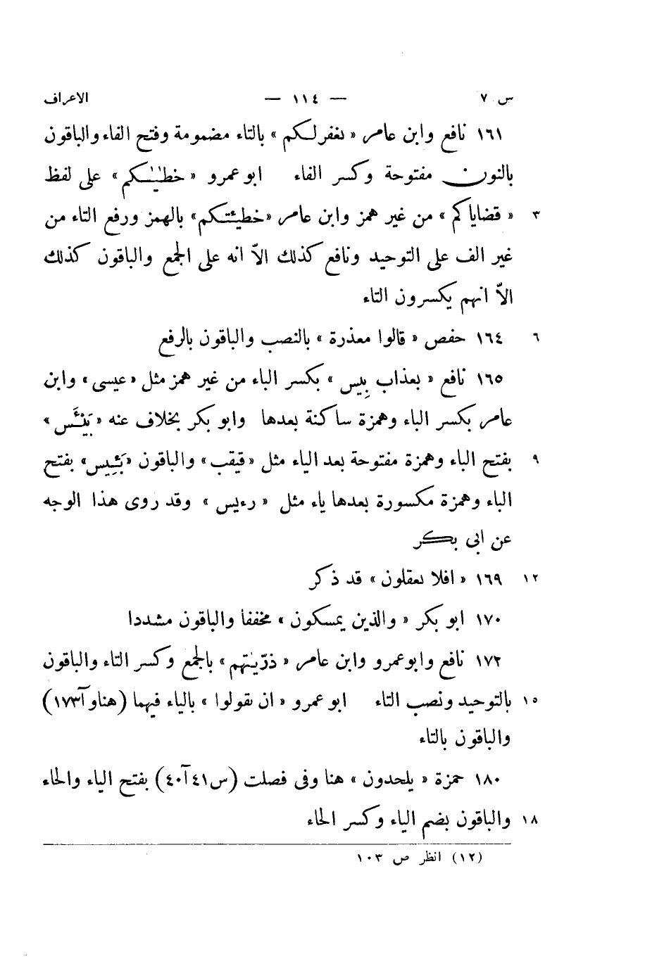 نَافِع وَابْن عَامر / تغْفر لكم / بِالتَّاءِ مَضْمُومَة وَفتح الْفَاء وَالْبَاقُونَ بالنُّون مَفْتُوحَة وَكسر الْفَاء ابو عَمْرو {خطاياكم} على لفظ قضاياكم من غير همز وَابْن عَامر / خطيئتكم / بِالْهَمْز وَرفع التَّاء من غير الف على التَّوْحِيد وَنَافِع كَذَلِك الا انه على الْجمع وَالْبَاقُونَ كَذَلِك الا انهم يكسرون التَّاء