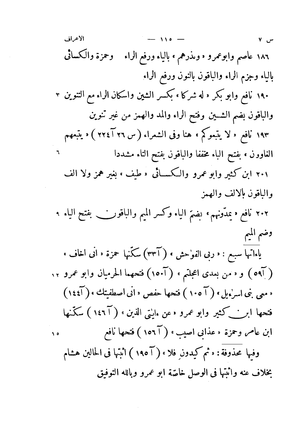 ابْن كثير وابو عَمْرو وَالْكسَائِيّ / طيف / بِغَيْر همز وَلَا الف وَالْبَاقُونَ بِفَتْح الْيَاء وَضم الْمِيم ياءاتها سبع {رَبِّي الْفَوَاحِش} سكنها حَمْزَة {إِنِّي أَخَاف} و {من بعدِي أعجلتم} فتحهما الحرميان وابو عَمْرو معنى {بني إِسْرَائِيل} فتحهَا حَفْص {إِنِّي اصطفيتك} فتحهَا ابْن كثير وابو عَمْرو / عَن ءاياتى الَّذين / سكنها ابْن عَامر وَحَمْزَة {عَذَابي أُصِيب} فتحهَا نَافِع
