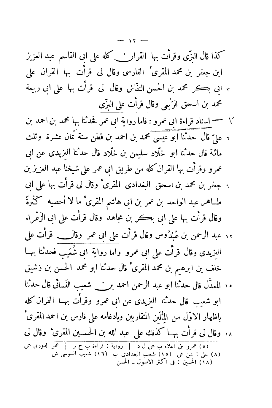 اسناد قِرَاءَة ابي عَمْرو فاما رِوَايَة ابي عمر فحدثنا بهَا مُحَمَّد بن احْمَد بن عَليّ قَالَ حَدثنَا ابو عِيسَى مُحَمَّد بن احْمَد بن قطن سنة ثَمَان عشرَة وَثلث مائَة قَالَ حَدثنَا ابو خَلاد سليمن بن خَلاد قَالَ حَدثنَا اليزيدي عَن ابي عَمْرو وقرأت بهَا الْقُرْآن كُله من طَرِيق ابي عمر على شَيخنَا عبد الْعَزِيز بن جَعْفَر بن مُحَمَّد بن اسحق الْبَغْدَادِيّ المقرىء وَقَالَ لي قَرَأت بهَا على ابي طَاهِر عبد الْوَاحِد بن عمر بن ابي هَاشم المقرىء مَا لَا أحصيه كَثْرَة وَقَالَ قَرَأت بهَا على ابي بكر بن مُجَاهِد وَقَالَ قَرَأت على ابي الزَّعْرَاء عبد الرَّحْمَن بن عَبدُوس وَقَالَ قَرَأت على ابي عمر وَقَالَ قَرَأت على اليزيدي وَقَالَ قَرَأت على ابي عَمْرو واما رِوَايَة ابي شُعَيْب فحدثنا بهَا خلف بن ابراهيم بن مُحَمَّد المقرىء قَالَ حَدثنَا ابو مُحَمَّد الْحسن بن رَشِيق الْمعدل قَالَ حَدثنَا ابو عبد الرَّحْمَن احْمَد بن شُعَيْب النَّسَائِيّ قَالَ حَدثنَا ابو شُعَيْب قَالَ حَدثنَا اليزيدي عَن ابي عَمْرو وقرأت بهَا الْقُرْآن كُله باظهار الاول من المثلين المتقاربين وبادغامه على فَارس بن احْمَد المقرىء وَقَالَ لي قَرَأت بهَا كَذَلِك على عبد الله بن الْحُسَيْن المقرىء وَقَالَ لي