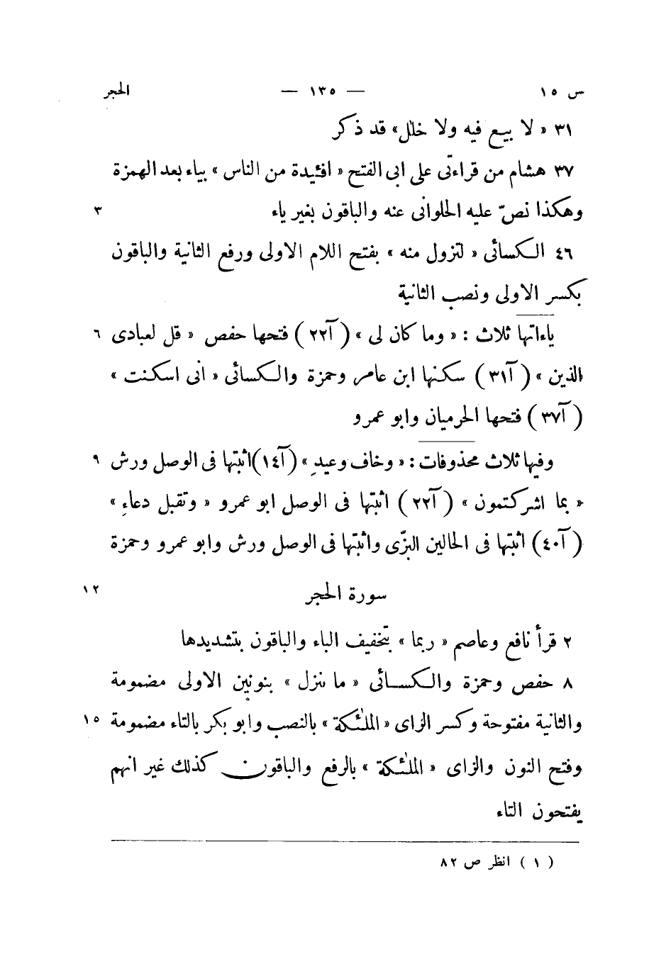 الكسائى {لتزول مِنْهُ} بِفَتْح اللَّام الاولى وَرفع الثَّانِيَة وَالْبَاقُونَ بِكَسْر الاولى وَنصب الثَّانِيَة ياءاتها ثَلَاث {وَمَا كَانَ لي} فتحهَا حَفْص {قل لعبادي الَّذين} سكنها ابْن عَامر وَحَمْزَة والكسائى {إِنِّي أسكنت} فتحهَا الحرميان وابو عَمْرو