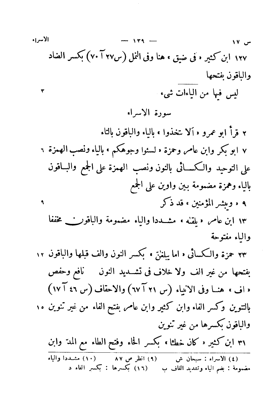 حَمْزَة والكسائى / اما يبلغان / بِكَسْر النُّون والف قبلهَا وَالْبَاقُونَ بِفَتْحِهَا من غير الف وَلَا خلاف تَشْدِيد النُّون نَافِع وَحَفْص {أُفٍّ} هُنَا وَفِي الانبياء والاحقاف بِالتَّنْوِينِ وَكسر الْفَاء وَابْن كثير وَابْن عَامر بِفَتْح الْفَاء من غير تَنْوِين وَالْبَاقُونَ بِكَسْرِهَا من غير تَنْوِين