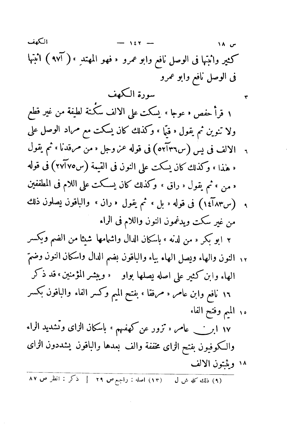قَرَأَ حَفْص {عوجا} يسكت على الالف سكتة لَطِيفَة من غير قطع وَلَا تَنْوِين ثمَّ يَقُول {قيمًا} وَكَذَلِكَ كَانَ يسكت مَعَ مُرَاد الْوَصْل على الالف فِي يس فِي قَوْله عز وَجل {من مرقدنا} ثمَّ يَقُول {هَذَا} وَكَذَلِكَ كَانَ يسكت على النُّون فِي الْقيمَة فِي قَوْله {من} ثمَّ يَقُول {راق} وَكَذَلِكَ كَانَ يسكت على اللَّام فِي المطففين فِي قَوْله {بل} ثمَّ يَقُول {ران} وَالْبَاقُونَ يصلونَ ذَلِك من غير سكت ويدغمون النُّون وَاللَّام فِي الرَّاء