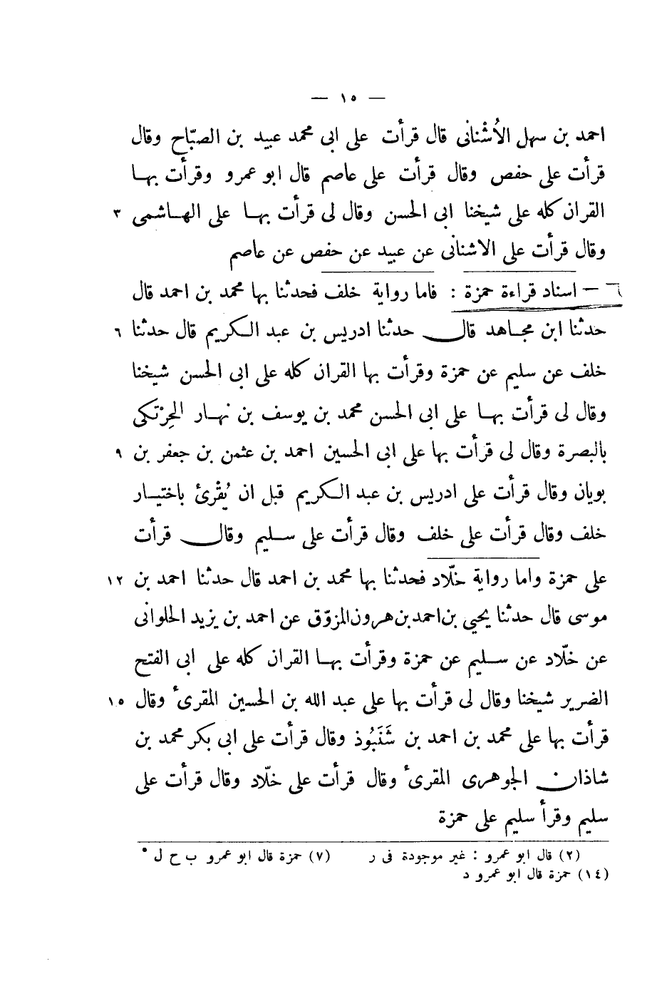 اسناد قِرَاءَة حَمْزَة فاما رِوَايَة خلف فحدثنا بهَا مُحَمَّد بن احْمَد قَالَ حَدثنَا ابْن مُجَاهِد قَالَ حَدثنَا ادريس بن عبد الْكَرِيم قَالَ حَدثنَا خلف عَن سليم عَن حَمْزَة وقرأت بهَا الْقُرْآن كُله على ابي الْحسن شَيخنَا وَقَالَ لي قَرَأت بهَا على ابي الْحسن مُحَمَّد بن يُوسُف بن نَهَار الحرتكي بِالْبَصْرَةِ وَقَالَ لي قَرَأت بهَا على ابي الْحُسَيْن احْمَد بن عُثْمَان بن جَعْفَر بن بويان وَقَالَ قَرَأت على ادريس بن عبد الْكَرِيم قبل ان يقرىء بِاخْتِيَار خلف وَقَالَ قَرَأت على خلف وَقَالَ قَرَأت على سليم وَقَالَ قَرَأت على حَمْزَة واما رِوَايَة خَلاد فحدثنا بهَا مُحَمَّد بن احْمَد قَالَ حَدثنَا احْمَد بن مُوسَى قَالَ حَدثنَا يحيى بن احْمَد بن هرون المزوق عَن احْمَد بن يزِيد الْحلْوانِي عَن خَلاد عَن سليم عَن حَمْزَة وقرأت بهَا الْقُرْآن كُله على ابي الْفَتْح الضَّرِير شَيخنَا وَقَالَ لي قَرَأت بهَا على عبد الله بن الْحُسَيْن المقرىء وَقَالَ قَرَأت بهَا على مُحَمَّد بن احْمَد بن شنبوذ وَقَالَ قَرَأت على ابي بكر مُحَمَّد بن شَاذان الْجَوْهَرِي المقرىء وَقَالَ قَرَأت على خَلاد وَقَالَ قَرَأت على سليم وَقَرَأَ سليم على حَمْزَة