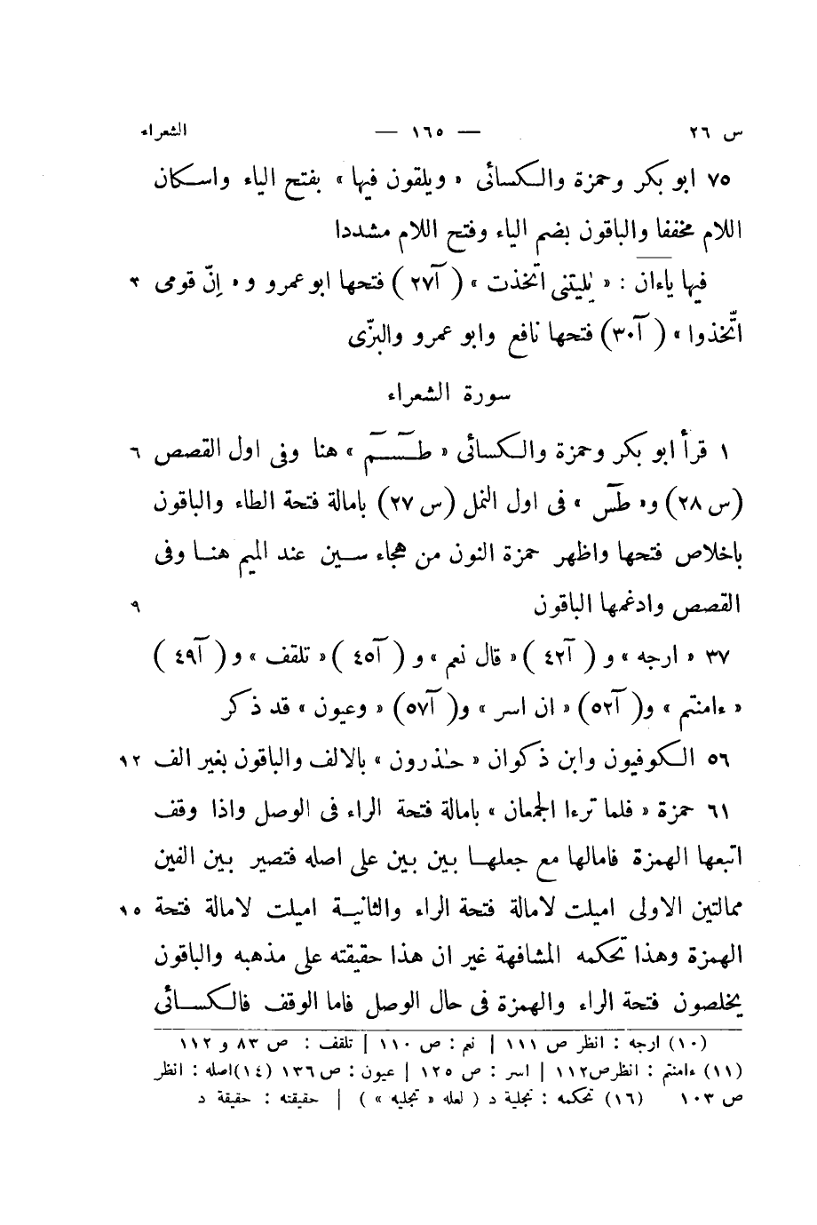 قَرَأَ ابو بكر وَحَمْزَة وَالْكسَائِيّ {طسم} هُنَا وَفِي اول الْقَصَص و {طس} فِي اول النَّمْل بامالة فَتْحة الطَّاء وَالْبَاقُونَ باخلاص فتحهَا واظهر حَمْزَة النُّون من هجاء سين عِنْد الْمِيم هُنَا وَفِي الْقَصَص وادغمها الْبَاقُونَ