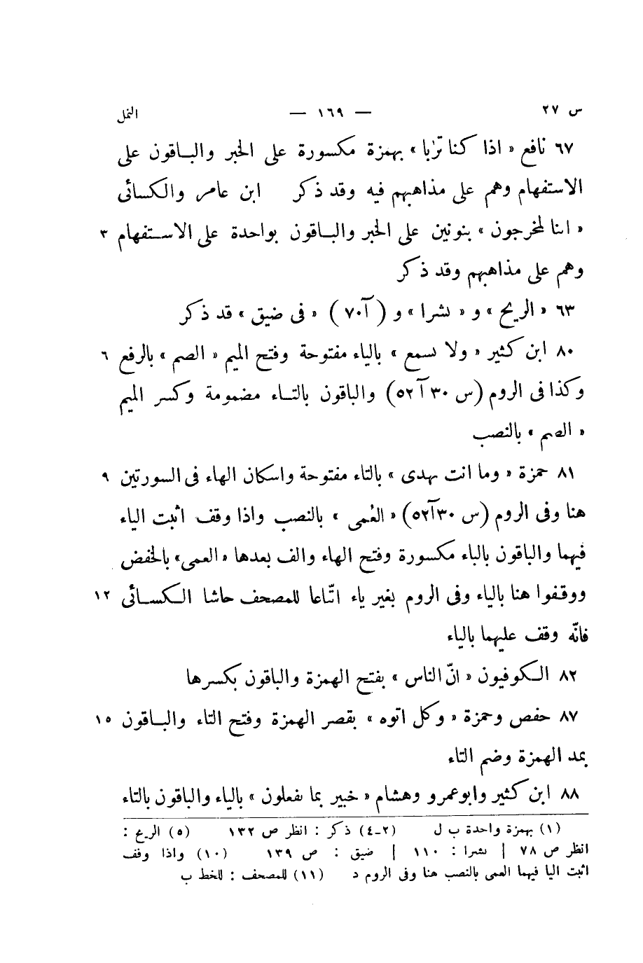 حَمْزَة / وَمَا انت تهدى / بِالتَّاءِ مَفْتُوحَة واسكان الْهَاء فِي السورتين هُنَا وَفِي الرّوم {الْعمي} بِالنّصب واذا وقف اثْبتْ الْيَاء فيهمَا وَالْبَاقُونَ بِالْبَاء مَكْسُورَة وَفتح الْهَاء والف بعْدهَا {الْعمي} بالخفض ووقفوا هُنَا بِالْيَاءِ وَفِي الرّوم بِغَيْر يَاء اتبَاعا للمصحف حاشا الْكسَائي فانه وقف عَلَيْهِمَا بِالْيَاءِ