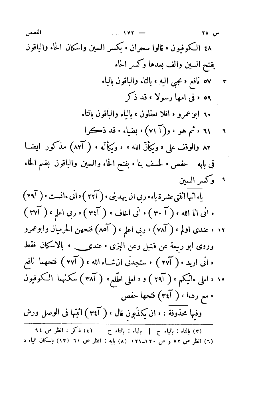 ياءاتها اثْنَتَيْ عشرَة يَاء {رَبِّي أَن يهديني} / اني ءانست / {إِنِّي أَنا الله} {إِنِّي أَخَاف} {رَبِّي أعلم} {عِنْدِي أَو لم} {رَبِّي أعلم} فتحهن الحرميان وابو عَمْرو وروى ابو ربيعَة عَن قنبل وَعَن البزى {عِنْدِي} بالاسكان فَقَط {إِنِّي أُرِيد} {ستجدني إِن شَاءَ الله} فتحهما نَافِع / لعَلي ءاتيكم / و {لعَلي أطلع} سكنهما الْكُوفِيُّونَ {معي ردْءًا} فتحهَا حَفْص