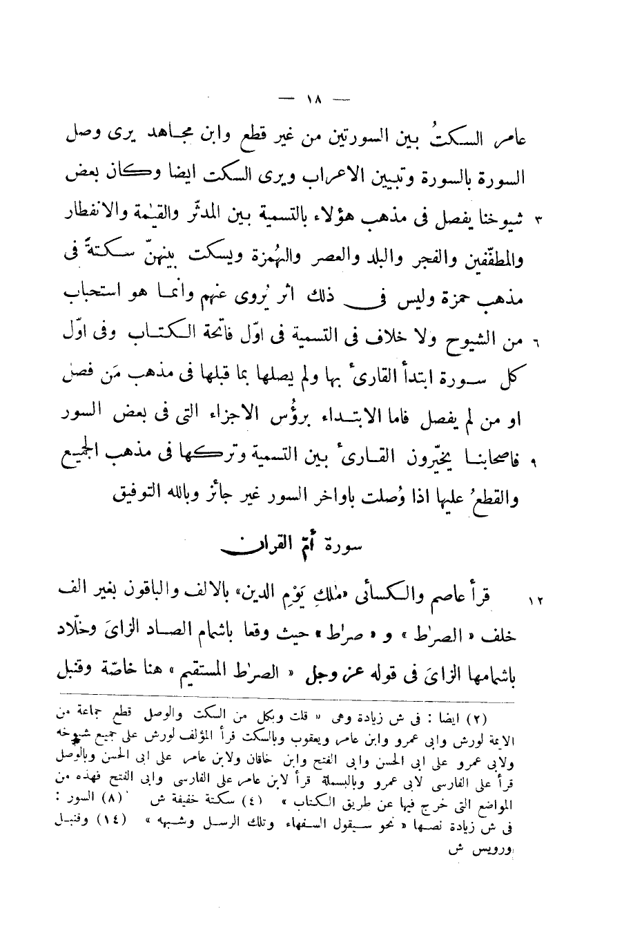 عَامر السكت بَين السورتين من غير قطع وَابْن مُجَاهِد يرى وصل السُّورَة بالسورة وتبيين الاعراب وَيرى السكت ايضا وَكَانَ بعض شُيُوخنَا يفصل فِي مَذْهَب هَؤُلَاءِ بِالتَّسْمِيَةِ بَين المدثر وَالْقِيَامَة والانفطار والمطففين وَالْفَجْر والبلد وَالْعصر والهمزة ويسكت بَينهُنَّ سكتة فِي مَذْهَب حَمْزَة وَلَيْسَ فِي ذَلِك اثر يرْوى عَنْهُم وانما هُوَ اسْتِحْبَاب من الشُّيُوخ وَلَا خلاف فِي التَّسْمِيَة فِي اول فَاتِحَة الْكتاب وَفِي اول كل سُورَة ابْتَدَأَ القارىء بهَا وَلم يصلها بِمَا قبلهَا فِي مَذْهَب من فصل اَوْ من لم يفصل فاما الِابْتِدَاء برؤس الاجزاء الَّتِي فِي بعض السُّور فأصحابنا يخيرون القارىء بَين التَّسْمِيَة وَتركهَا فِي مَذْهَب الْجَمِيع وَالْقطع عَلَيْهَا اذا وصلت باواخر السُّور غير جَائِز وَبِاللَّهِ التَّوْفِيق