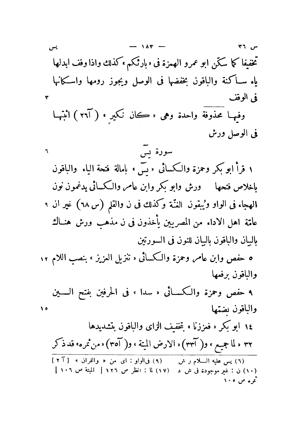 قَرَأَ ابو بكر وَحَمْزَة وَالْكسَائِيّ {يس} بامالة فَتْحة الْيَاء وَالْبَاقُونَ باخلاص فتحهَا ورش وابو بكر وَابْن عَامر وَالْكسَائِيّ يدغمون نون الهجاء فِي الْوَاو ويبقون الغنة وَكَذَلِكَ فِي ن والقلم غير ان عَامَّة اهل الاداء من المصريين يَأْخُذُونَ فِي ن مَذْهَب ورش هُنَاكَ بِالْبَيَانِ وَالْبَاقُونَ بِالْبَيَانِ للنون فِي السورتين