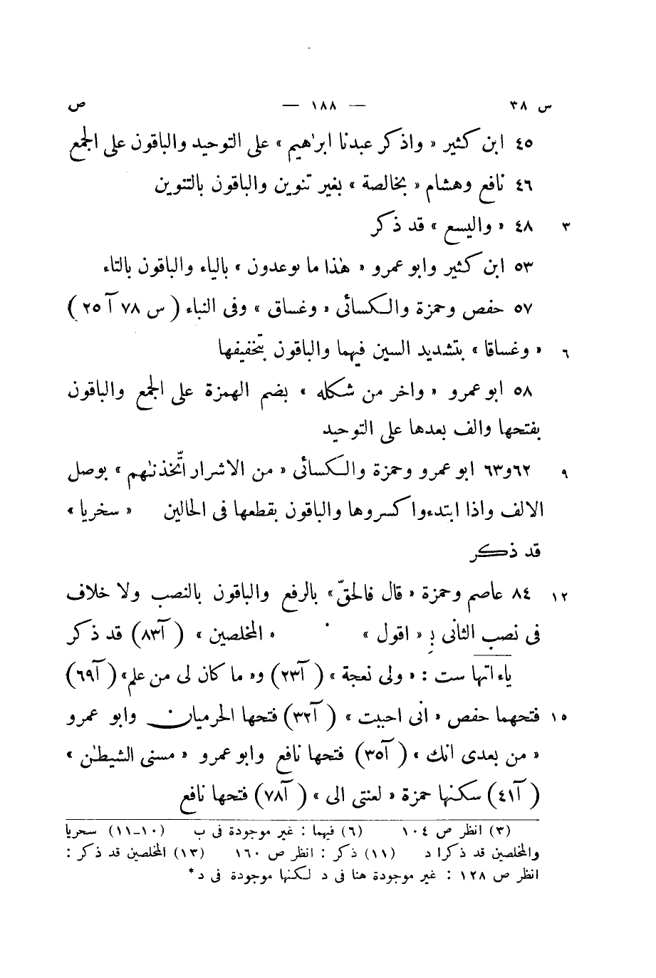 ابو عَمْرو وَحَمْزَة وَالْكسَائِيّ / من الاشرار اتخذنهم / بوصل الالف واذا ابتدءوا كسروها وَالْبَاقُونَ بقطعها فِي الْحَالين {سخريا} قد ذكر