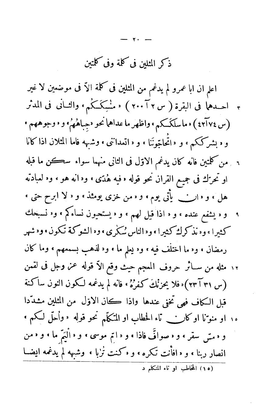 اعْلَم ان ابا عَمْرو لم يدغم من المثلين فِي كلمة الا فِي موضِعين لَا غير أَحدهمَا فِي الْبَقَرَة / منسككم / وَالثَّانِي فِي المدثر {مَا سلككم} واظهر مَا عداهما نَحْو {جباههم} و {وُجُوههم} و {بشرككم} و {أتحاجوننا} و / انعدانني / وَشبهه فاما المثلان اذا كَانَا من كَلِمَتَيْنِ فانه كَانَ يدغم الاول فِي الثَّانِي مِنْهُمَا سَوَاء سكن مَا قبله اَوْ تحرّك فِي جَمِيع الْقُرْآن نَحْو قَوْله {فِيهِ هدى} و {إِنَّه هُوَ} و {لعبادته هَل} و {أَن يَأْتِي يَوْم} و / وَمن خزى يَوْمئِذٍ / و {لَا أَبْرَح حَتَّى} و {يشفع عِنْده} و {إِذا قيل لَهُم} و {ويستحيون نساءكم} و {نسبحك كثيرا} و {ونذكرك كثيرا} و {النَّاس سكارى} و {الشَّوْكَة تكون} و {شهر رَمَضَان} وَمَا {اخْتلف فِيهِ} و {يعلم مَا} و {لذهب بسمعهم} وَمَا كَانَ مثله من سَائِر حُرُوف المعجم حَيْثُ وَقع الا قَوْله عز وَجل فِي لقمن {فَلَا يحزنك كفره} فانه لم يدغمه لكَون النُّون سَاكِنة قبل الْكَاف فَهِيَ تخفي عِنْدهَا واذا كَانَ الأول من المثلين مشددا اَوْ منونا اَوْ كَانَ تَاء الْخطاب اَوْ الْمُتَكَلّم نَحْو قَوْله {وَأحل لكم} و {مس سقر} و {صواف فَإِذا} و {أم مُوسَى} و {أَلِيم مَا} و {من أنصار رَبنَا} و {أفأنت تكره} و {كنت تُرَابا} وَشبهه لم يدغمه ايضا