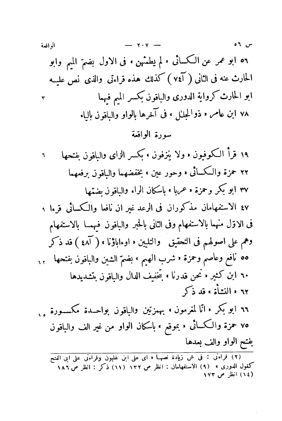 ابو عمر عَن الْكسَائي {لم يطمثهن} فِي الاول بِضَم الْمِيم وابو الْحَارِث عَنهُ فِي الثَّانِي كَذَلِك هَذِه قراءتي وَالَّذِي نَص عَلَيْهِ ابو الْحَارِث كَرِوَايَة الدوري وَالْبَاقُونَ بِكَسْر الْمِيم فيهمَا
