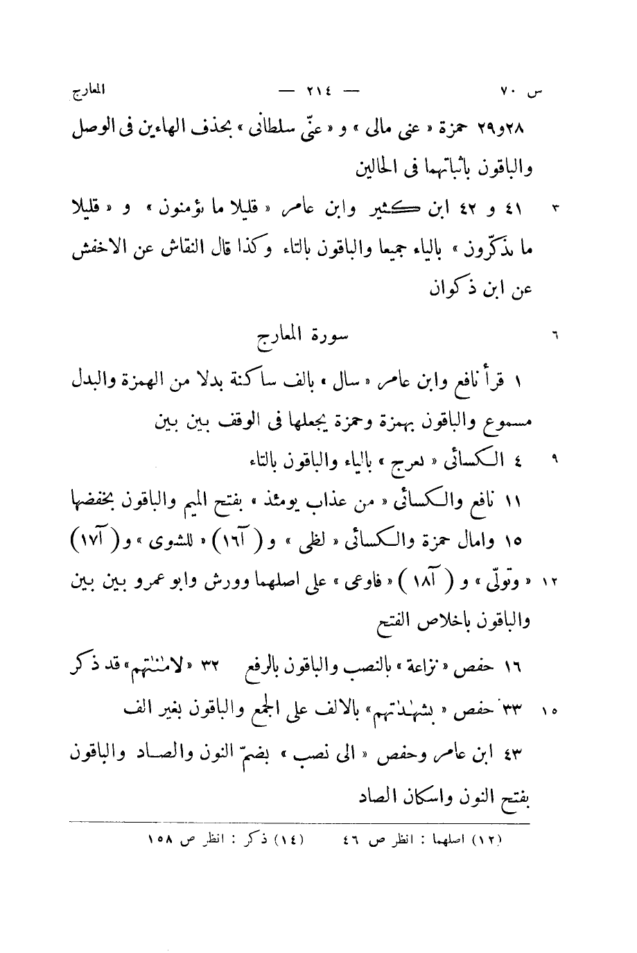 نَافِع وَالْكسَائِيّ {من عَذَاب يَوْمئِذٍ} بِفَتْح الْمِيم وَالْبَاقُونَ بخفضها وامال حَمْزَة وَالْكسَائِيّ {لظى} و {للشوى} و {وَتَوَلَّى} و {فأوعى} على اصلهما وورش وابو عَمْرو بَين بَين وَالْبَاقُونَ باخلاص الْفَتْح