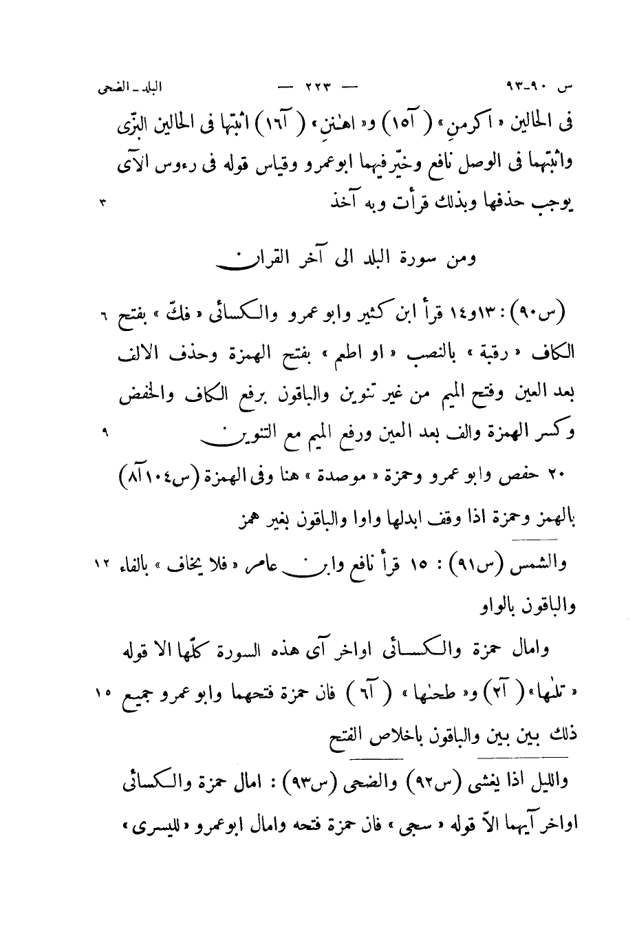 العلق قَرَأَ قنبل ان رَاه بقصر الْهمزَة وَالْبَاقُونَ بمدها وامال حَمْزَة وَالْكسَائِيّ اواخر آي هَذِه السُّورَة من لدن قَوْله ليطْغى الى قَوْله بَان الله يرى واما ابو عَمْرو يرى وَحده وَمَا عداهُ بَين بَين وورش جَمِيع ذَلِك بَين بَين وَالْبَاقُونَ باخلاص الْفَتْح
