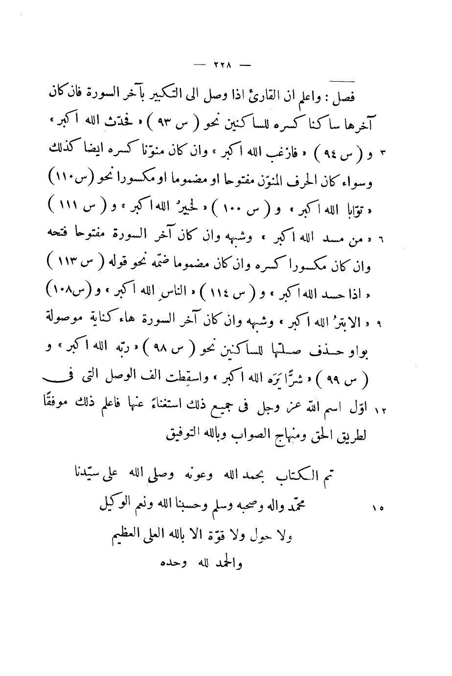 تمّ الْكتاب بِحَمْد الله وعونه وَصلى الله على سيدنَا مُحَمَّد وَآله وَصَحبه وَسلم وحسبنا الله وَنعم الْوَكِيل وَلَا حول وَلَا قُوَّة الا بِاللَّه الْعلي الْعَظِيم وَالْحَمْد لله وَحده