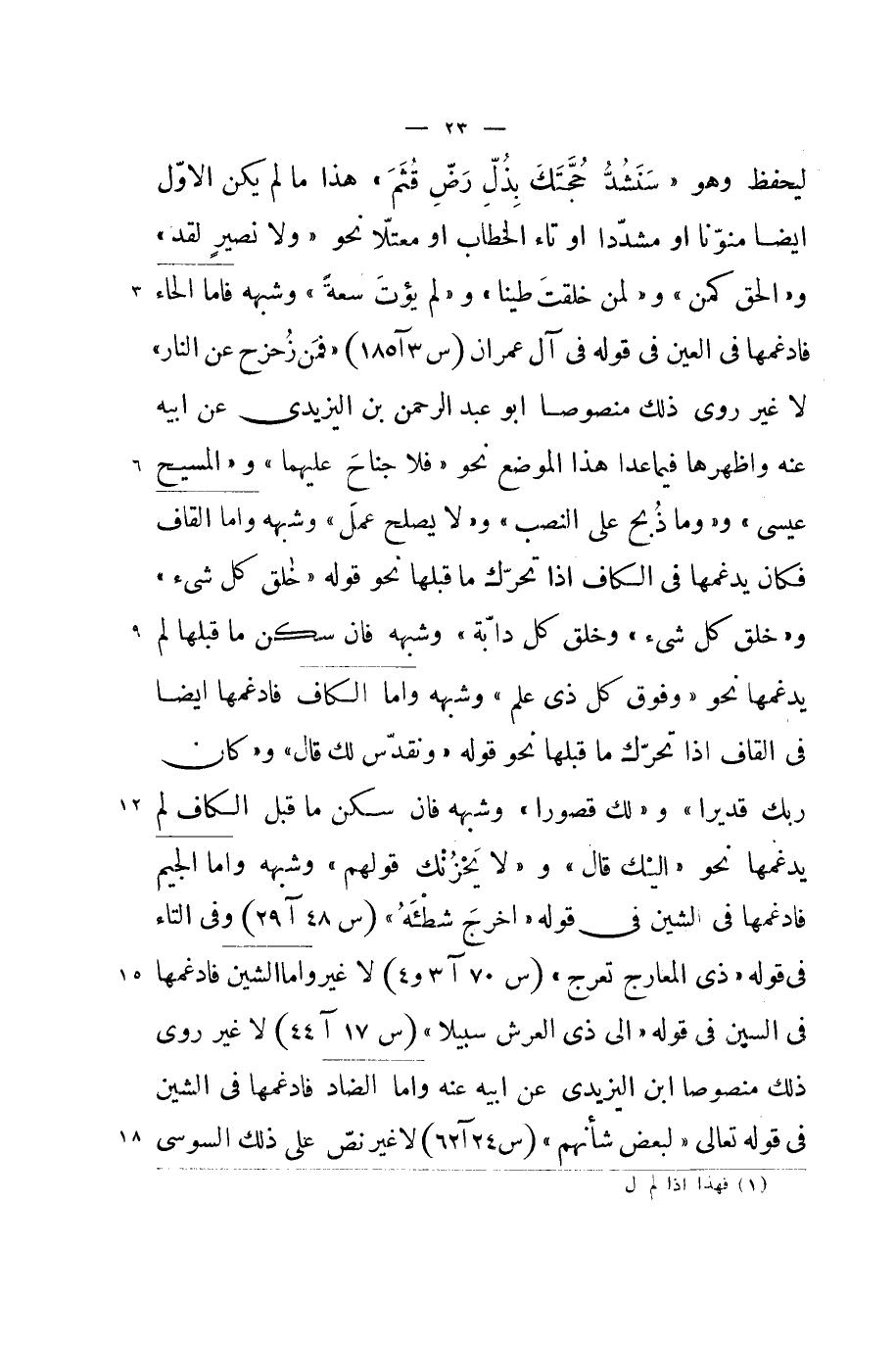 ليحفظ وَهُوَ سنشد حجتك بذل رض قثم هَذَا مَا لم يكن الأول ايضا منونا اَوْ مشددا اَوْ تَاء الْخطاب اَوْ مُعْتَلًّا نَحْو {وَلَا نصير لقد} و {الْحق كمن} و {لمن خلقت طينا} و {وَلم يُؤْت سَعَة} وَشبهه فاما الْحَاء فادغمها فِي الْعين فِي قَوْله فِي آل عمرَان {فَمن زحزح عَن النَّار} لَا غير روى ذَلِك مَنْصُوصا ابو عبد الرَّحْمَن بن اليزيدي عَن ابيه عَنهُ واظهرها فِيمَا عدا هَذَا الْموضع نَحْو {فَلَا جنَاح عَلَيْهِمَا} و {الْمَسِيح عِيسَى} و {وَمَا ذبح على النصب} و {لَا يصلح عمل} وَشبهه واما الْقَاف فَكَانَ يدغمها فِي الْكَاف اذا تحرّك مَا قبلهَا نَحْو قَوْله {خَالق كل شَيْء} و {وَخلق كل شَيْء} و {خلق كل دَابَّة} وَشبهه فان سكن مَا قبلهَا لم يدغمها نَحْو {وَفَوق كل ذِي علم} وَشبهه واما الْكَاف فادغمها ايضا فِي الْقَاف اذا تحرّك مَا قبلهَا نَحْو قَوْله {ونقدس لَك قَالَ} و {وَكَانَ رَبك قَدِيرًا} و {لَك قصورا} وَشبهه فان سكن مَا قبل الْكَاف لم يدغمها نَحْو {إِلَيْك قَالَ} و {وَلَا يحزنك قَوْلهم} وَشبهه واما الْجِيم فادغمها فِي الشين فِي قَوْله {أخرج شطأه} وَفِي التَّاء فِي قَوْله {ذِي المعارج تعرج} لَا غير واما الشين فادغمها فِي السِّين فِي قَوْله {إِلَى ذِي الْعَرْش سَبِيلا} لَا غير روى ذَلِك مَنْصُوصا ابْن اليزيدي عَن ابيه عَنهُ واما الضَّاد فادغمها فِي الشين فِي قَوْله تَعَالَى {لبَعض شَأْنهمْ} لَا غير نَص على ذَلِك السُّوسِي