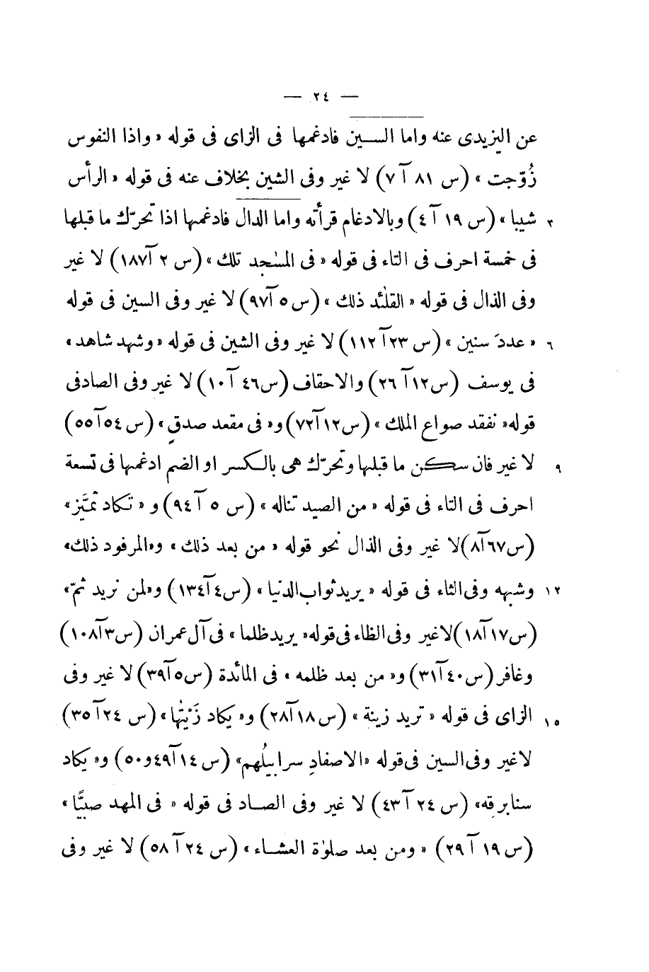 عَن اليزيدي عَنهُ واما السِّين فادغمها فِي الزَّاي فِي قَوْله {وَإِذا النُّفُوس زوجت} لَا غير وَفِي الشين بِخِلَاف عَنهُ فِي قَوْله {الرَّأْس شيبا} وبالادغام قرأته واما الدَّال فادغمها اذا تحرّك مَا قبلهَا فِي خَمْسَة احرف فِي التَّاء فِي قَوْله {فِي الْمَسَاجِد تِلْكَ} لَا غير وَفِي الذَّال فِي قَوْله {والقلائد ذَلِك} لَا غير وَفِي السِّين فِي قَوْله {عدد سِنِين} لَا غير وَفِي الشين فِي قَوْله {وَشهد شَاهد} فِي يُوسُف والاحقاف لَا غير وَفِي الصادفي قَوْله {نفقد صواع الْملك} و {فِي مقْعد صدق} لَا غير فان سكن مَا قبلهَا وتحرك هِيَ بِالْكَسْرِ اَوْ الضَّم ادغمها فِي تِسْعَة احرف فِي التَّاء فِي قَوْله {من الصَّيْد تناله} و {تكَاد تميز} لَا غير وَفِي الذَّال نَحْو قَوْله {من بعد ذَلِك} و {المرفود ذَلِك} وَشبهه وَفِي الثَّاء فِي قَوْله {يُرِيد ثَوَاب الدُّنْيَا} و {لمن نُرِيد ثمَّ} لَا غير وَفِي الظَّاء فِي قَوْله {يُرِيد ظلما} فِي آل عمرَان وغافر و {من بعد ظلمه} فِي الْمَائِدَة لَا غير وَفِي الزَّاي فِي قَوْله {تُرِيدُ زِينَة} و {يكَاد زيتها} لَا غير وَفِي السِّين فِي قَوْله {الأصفاد سرابيلهم} و {يكَاد سنا برقه} لَا غير وَفِي الصَّاد فِي قَوْله {فِي المهد صَبيا} {وَمن بعد صَلَاة الْعشَاء} لَا غير وَفِي