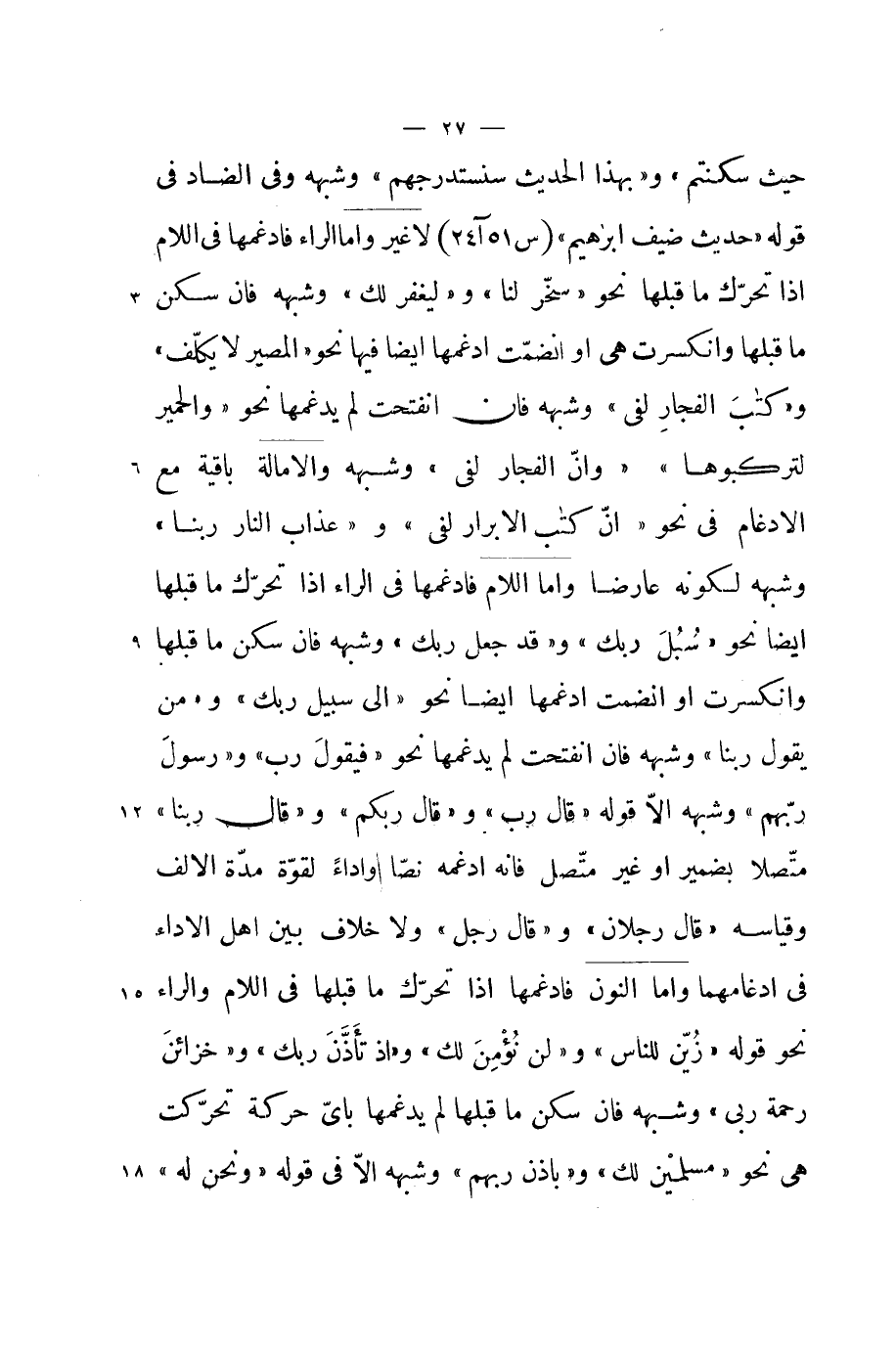 {حَيْثُ سكنتم} ) و {بِهَذَا الحَدِيث سنستدرجهم} وَشبهه وَفِي الضَّاد فِي قَوْله {حَدِيث ضيف إِبْرَاهِيم} لَا غير واما الرَّاء فادغمها فِي اللَّام اذا تحرّك مَا قبلهَا نَحْو {سخر لنا} و {ليغفر لَك} وَشبهه فان سكن مَا قبلهَا وانكسرت هِيَ اوانضمت ادغمها ايضا فِيهَا نَحْو {الْمصير لَا يُكَلف} و {كتاب الْفجار لفي} وَشبهه فان انفتحت لم يدغمها نَحْو {وَالْحمير لتركبوها} {وَإِن الْفجار لفي} وَشبهه والامالة بَاقِيَة مَعَ الادغام فِي نَحْو {إِن كتاب الْأَبْرَار لفي} و {عَذَاب النَّار رَبنَا} وَشبهه لكَونه عارضا واما اللَّام فادغمها فِي الرَّاء اذا تحرّك مَا قبلهَا ايضا نَحْو {سبل رَبك} و {قد جعل رَبك} وَشبهه فان سكن مَا قبلهَا وانكسرت اَوْ انضمت ادغمها ايضا نَحْو {إِلَى سَبِيل رَبك} و {من يَقُول رَبنَا} وَشبهه فان انفتحت لم يدغمها نَحْو {فَيَقُول رب} و {رَسُول رَبهم} وَشبهه الا قَوْله {قَالَ رب} {وَقَالَ ربكُم} و {قَالَ رَبنَا} مُتَّصِلا بضمير اَوْ غير مُتَّصِل فانه ادغمه نصا واداء لقُوَّة مُدَّة الالف وَقِيَاسه {قَالَ رجلَانِ} و {وَقَالَ رجل} وَلَا خلاف بَين اهل الاداء فِي ادغامهما واما النُّون فادغمها اذا تحرّك مَا قبلهَا فِي اللَّام وَالرَّاء نَحْو قَوْله {زين للنَّاس} و {لن نؤمن لَك} و {وَإِذ تَأذن رَبك} و {خَزَائِن رَحْمَة رَبِّي} وَشبهه فان سكن مَا قبلهَا لم يدغمها باي حَرَكَة تحركت هِيَ نَحْو {مُسلمين لَك} و {بِإِذن رَبهم} وَشبهه الا فِي قَوْله {وَنحن لَهُ}