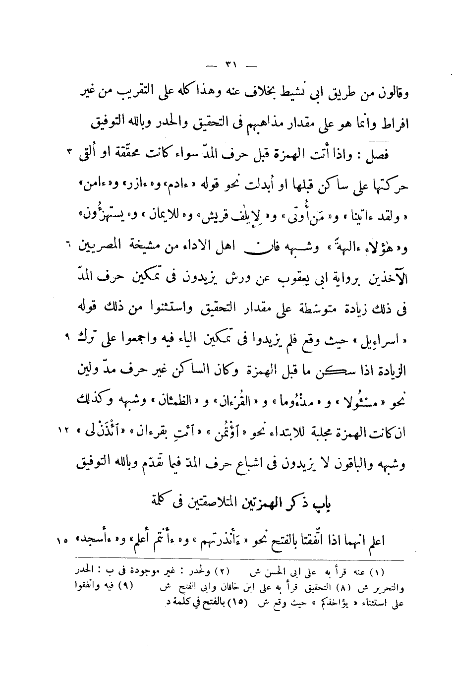 فصل واذا أَتَت الْهمزَة قبل حرف الْمَدّ سَوَاء كَانَت مُحَققَة اَوْ القى حركتها على سَاكن قبلهَا اَوْ ابدلت نَحْو قَوْله / ءادم / و / ءازر / و / ءامن / و / لقد ءاتينا / و {من أُوتِيَ} و / لاءيلاف قُرَيْش / و {للْإيمَان} و / يستهزءون / و / هَؤُلَاءِ ءالهة / وَشبهه فان اهل الاداء من مشيخة المصريين الآخذين بِرِوَايَة ابي يَعْقُوب عَن ورش يزِيدُونَ فِي تَمْكِين حرف الْمَدّ فِي ذَلِك زِيَادَة متوسطة على مِقْدَار التَّحْقِيق واستثنوا من ذَلِك قَوْله / اسراءيل / حَيْثُ وَقع فَلم يزِيدُوا فِي تَمْكِين الْيَاء فِيهِ واجمعوا على ترك الزِّيَادَة اذا سكن مَا قبل الْهمزَة وَكَانَ السَّاكِن غير حرف مد ولين نَحْو / مسئولا / و / مذءوما / و / القرءان / و / الظمئان / وَشبهه وَكَذَلِكَ ان كَانَت الْهمزَة مجلبة للابتداء نَحْو {اؤتمن} / ائْتِ بقرءان / {ائْذَنْ لي} وَشبهه وَالْبَاقُونَ لَا يزِيدُونَ فِي اشباع حرف الْمَدّ فِيمَا تقدم وَبِاللَّهِ التَّوْفِيق - صَلَّى اللَّهُ عَلَيْهِ وَسَلَّم َ - بَاب ذكر الهمزتين المتلاصقتين فِي كلمة - صَلَّى اللَّهُ عَلَيْهِ وَسَلَّم َ -