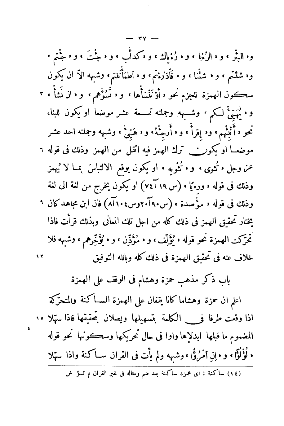 والبئر و / الرءيا / و / رءياك / و {كدأب} و {جِئْت} و {جئْتُمْ} و {شِئْتُم} و {شِئْنَا} و / فادارءتم / و {اطمأننتم} وَشبهه الا ان يكون سُكُون الْهمزَة للجزم نَحْو / أَو ننسأها / و {تسؤهم} و {إِن نَشأ} و {ويهيئ لكم} وَشبهه وَجُمْلَته تِسْعَة عشر موضعا اَوْ يكون للْبِنَاء نَحْو {أنبئهم} و {اقْرَأ} و / أرجئه / وهيىء وَشبهه وَجُمْلَته اُحْدُ عشر موضعا اَوْ يكون ترك الْهَمْز فِيهِ اثقل من الْهَمْز وَذَلِكَ فِي قَوْله عز وَجل / تؤى / و / تؤيه / اَوْ يكون يُوقع الالتباس بِمَا لَا يهمز وَذَلِكَ فِي قَوْله / ورءيا / اَوْ يكون يخرج من لُغَة الى لُغَة وَذَلِكَ فِي قَوْله {مؤصدة} فان ابْن مُجَاهِد كَانَ يخْتَار تَحْقِيق الْهَمْز فِي ذَلِك كُله من اجل تِلْكَ الْمعَانِي وَبِذَلِك قَرَأت فاذا تحركت الْهمزَة نَحْو قَوْله {يؤلف} و {مُؤذن} و {يؤخرهم} وَشبهه فَلَا خلاف عَنهُ فِي تَحْقِيق الْهمزَة فِي ذَلِك كُله وَبِاللَّهِ التَّوْفِيق - صَلَّى اللَّهُ عَلَيْهِ وَسَلَّم َ - بَاب ذكر مَذْهَب حَمْزَة وَهِشَام فِي الْوَقْف على الْهمزَة