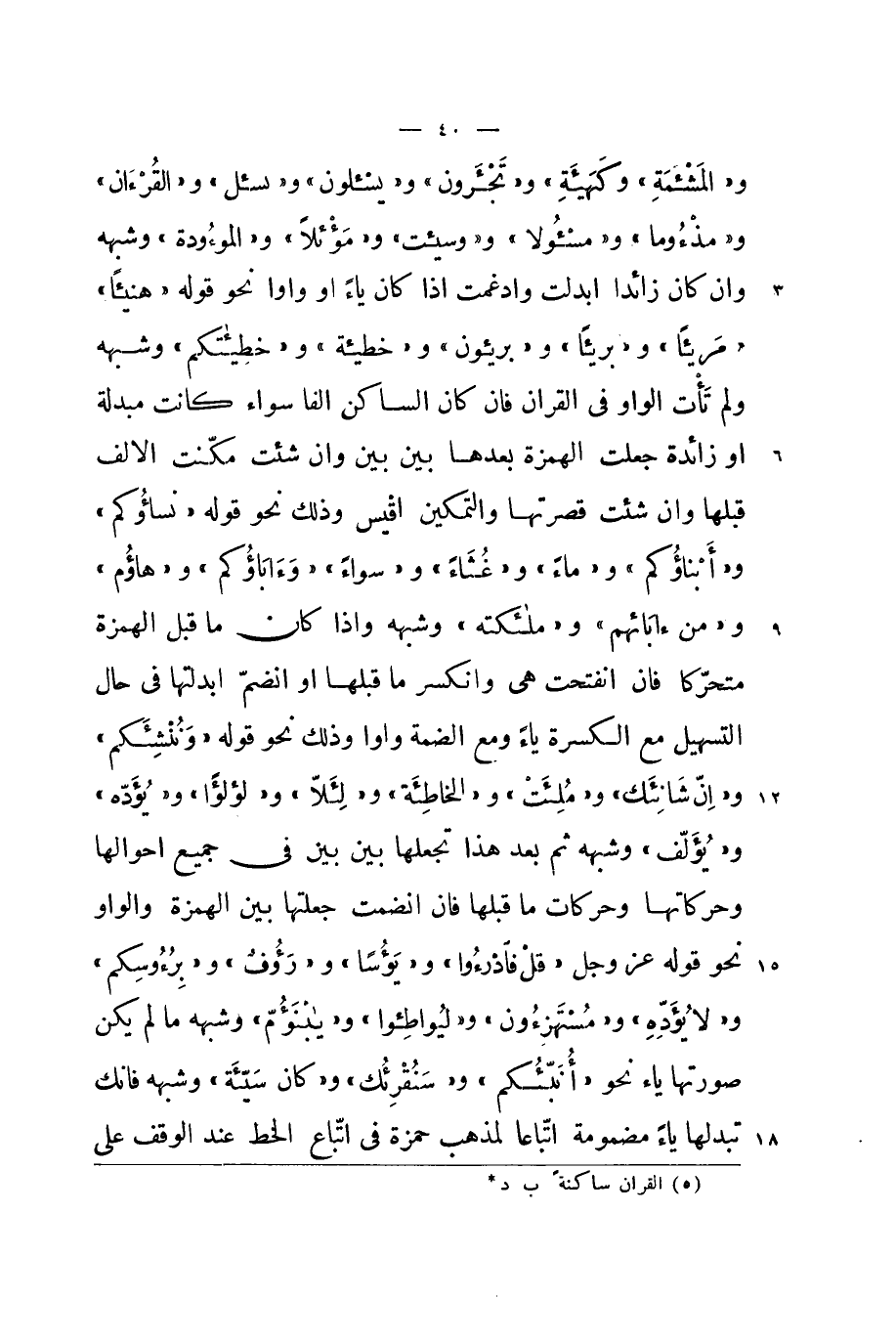 و / المشئمة / و {كَهَيئَةِ} و / تجئرون / و / يسئلون / و / يسئل / و / القرءان / و / مذءوما / و / مسئولا / و / سيئت / و {موئلا} و / الموءودة / وَشبهه وان كَانَ زَائِدا ابدلت وادغمت اذا كَانَ يَاء اَوْ واوا نَحْو قَوْله {هَنِيئًا} {مريئا} و {بَرِيئًا} و {بريئون} و {خَطِيئَة} و / خطيأتكم / وَشبهه وَلم تأت الْوَاو فِي الْقرَان فان كَانَ السَّاكِن الْفَا سَوَاء كَانَت مبدلة اَوْ زَائِدَة جعلت الْهمزَة بعْدهَا بَين بَين وان شِئْت مكنت الالف قبلهَا وان شِئْت قصرتها والتمكين اقيس وَذَلِكَ نَحْو قَوْله {نِسَاؤُكُمْ} و / أبناؤكم / و {مَاء} و {غثاء} و {سَوَاء} و / ءاباؤكم / و {هاؤم} و / وَمن ءابائهم / و {وَمَلَائِكَته} وَشبهه واذا كَانَ مَا قبل الْهمزَة متحركا فان انفتحت هِيَ وانكسر مَا قبلهَا اَوْ انْضَمَّ ابدلتها فِي حَال التسهيل مَعَ الكسرة يَاء وَمَعَ الضمة واوا وَذَلِكَ نَحْو قَوْله {وننشئكم} و {إِن شانئك} و {ملئت} والخاطئة و {لِئَلَّا} و {لؤلؤا} و {يؤده} و {يؤلف} وَشبهه ثمَّ بعد هَذَا تجعلها بَين بَين فِي جَمِيع احوالها وحركاتها وحركات مَا قبلهَا فان انضمت جَعلتهَا بَين الْهمزَة وَالْوَاو نَحْو قَوْله عز وَجل قل / فادرءوا / و / يؤسا / و / رءوف / و / برءوسكم / و {لَا يؤده} و / مستهزءون / و {ليواطئوا} و / يابنؤم / وَشبهه مَا لم يكن صورتهَا يَاء نَحْو {أنبئكم} و {سنقرئك} و {كَانَ سيئه} وَشبهه فانك تبدلها يَاء مَضْمُومَة اتبَاعا لمَذْهَب حَمْزَة فِي اتِّبَاع الْخط عِنْد الْوَقْف على