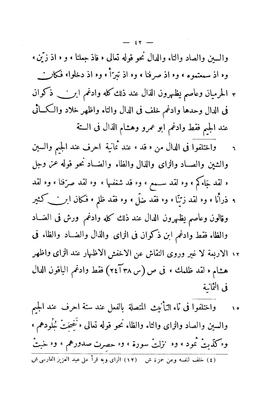 وَاخْتلفُوا فِي الدَّال من قد عِنْد ثَمَانِيَة احرف عِنْد الْجِيم وَالسِّين والشين وَالصَّاد وَالزَّاي والذال والظاء وَالضَّاد نَحْو قَوْله عز وَجل {لقد جَاءَكُم} و {لقد سمع} و {قد شغفها} و {وَلَقَد صرفنَا} و {وَلَقَد ذرأنا} و {وَلَقَد زينا} و {فقد ضل} و {فقد ظلم} فَكَانَ ابْن كثير وقالون وَعَاصِم يظهرون الدَّال عِنْد ذَلِك كُله وادغم ورش فِي الضَّاد والظاء فَقَط وادغم ابْن ذكْوَان فِي الزاى والذال وَالضَّاد والظاء فِي الاربعة لَا غير وروى النقاش عَن الاخفش الاظهار عِنْد الزاى واظهر هِشَام {لقد ظلمك} فى ص فَقَط وادغم الْبَاقُونَ الدَّال فِي الثَّمَانِية