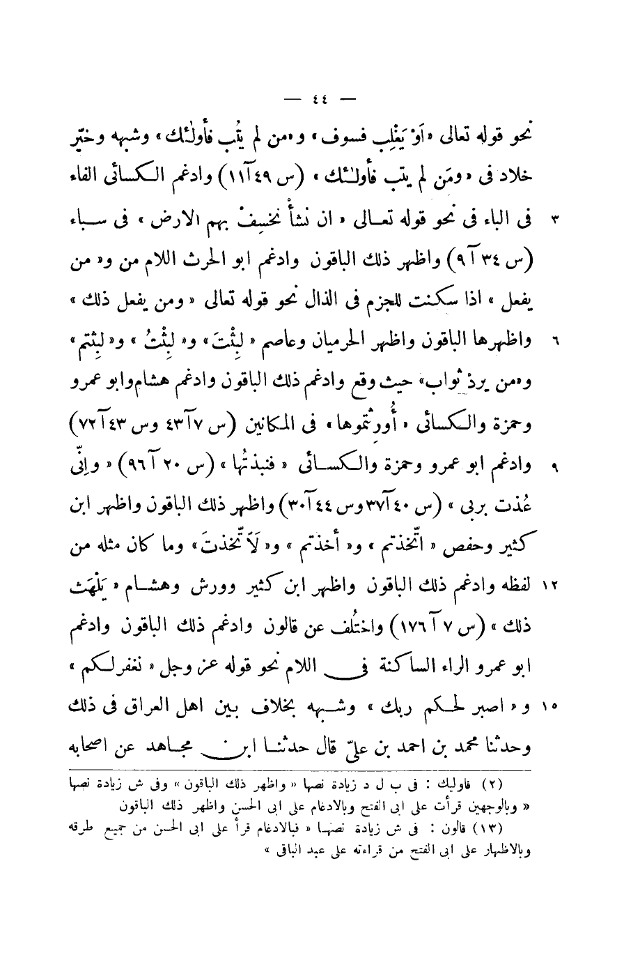 نَحْو قَوْله تَعَالَى {أَو يغلب فَسَوف} و {وَمن لم يتب فَأُولَئِك} وَشبهه وَخير خَلاد فِي {وَمن لم يتب فَأُولَئِك} وادغم الْكسَائي الْفَاء فِي الْبَاء نَحْو قَوْله تَعَالَى {إِن نَشأ نخسف بهم الأَرْض} فِي سباء واظهر ذَلِك الْبَاقُونَ وادغم ابو الْحَرْث اللَّام من {وَمن يفعل} اذا سكنت للجزم فِي الذَّال نَحْو قَوْله تَعَالَى {وَمن يفعل ذَلِك} واظهرها الْبَاقُونَ واظهر الحرميان وَعَاصِم {لَبِثت} و {لَبِثت} و {لبثتم} و {وَمن يرد ثَوَاب} حَيْثُ وَقع وادغم ذَلِك الْبَاقُونَ وادغم هِشَام وابو عَمْرو وَحَمْزَة وَالْكسَائِيّ {أورثتموها} فِي المكانين وادغم ابو عَمْرو وَحَمْزَة وَالْكسَائِيّ {فنبذتها} و {إِنِّي عذت بربي} واظهر ذَلِك الْبَاقُونَ واظهر ابْن كثير وَحَفْص {اتخذتم} و {أَخَذْتُم} و {لاتخذت} وَمَا كَانَ مثله من لَفظه وادغم ذَلِك الْبَاقُونَ واظهر ابْن كثير وورش وَهِشَام {يَلْهَث ذَلِك} وَاخْتلف عَن قالون وادغم ذَلِك الْبَاقُونَ وادغم ابو عَمْرو الرَّاء الساكنة فِي اللَّام نَحْو قَوْله عز وَجل {نغفر لكم} و {واصبر لحكم رَبك} وَشبهه بِخِلَاف بَين اهل الْعرَاق فِي ذَلِك