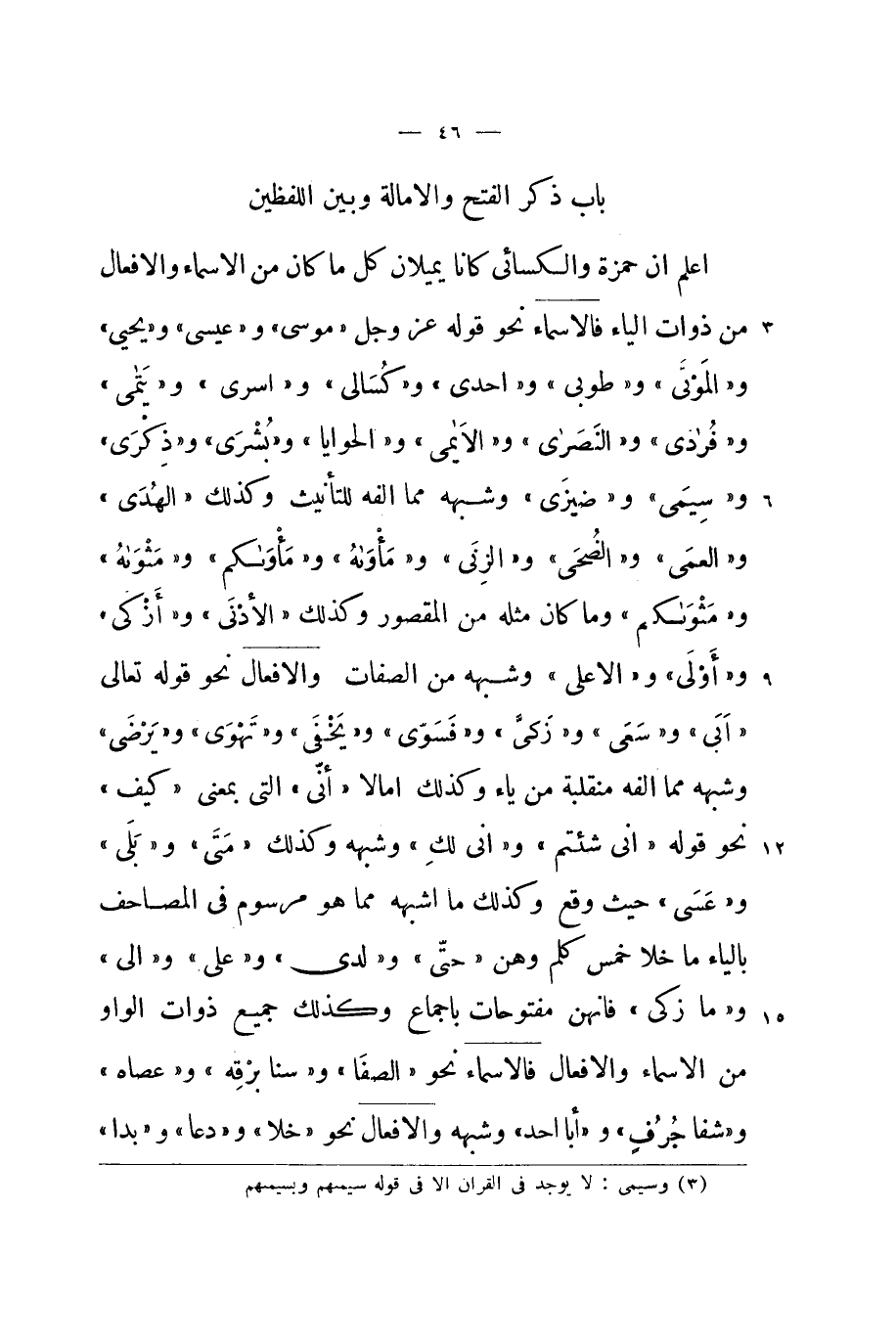 اعْلَم ان حَمْزَة وَالْكسَائِيّ كَانَا يميلان كل مَا كَانَ من الاسماء والافعال من ذَوَات الْيَاء فالاسماء نَحْو قَوْله عز وَجل {مُوسَى} و {عِيسَى} و {يحيي} و {الْمَوْتَى} و {طُوبَى} و {إِحْدَى} و {كسَالَى} و {أسرى} و {يتامى} و {فُرَادَى} و {النَّصَارَى} و {الْأَيَامَى} و {الحوايا} و {بشرى} و {ذكرى} وسيمى و {ضيزى} وَشبهه مِمَّا الفه للتأنيث وَكَذَلِكَ {الْهدى} و {الْعمي} و {وَالضُّحَى} و {الزِّنَى} و {ومأواه} و {مأواكم} و {مثواه} و {مثواكم} وَمَا كَانَ مثله من الْمَقْصُور وَكَذَلِكَ {الْأَدْنَى} و {أزكى} و {أولي} و {الْأَعْلَى} وَشبهه من الصِّفَات والافعال نَحْو قَوْله تَعَالَى {أَبى} و {سعى} و / زكى / و {فسوى} و {يخفى} و {تهوى} و {يرضى} وَشبهه مِمَّا الفه منقلبة من يَاء وَكَذَلِكَ امالا {إِنِّي} الَّتِي بِمَعْنى {كَيفَ} نَحْو قَوْله {أَنى شِئْتُم} و {أَنى لَك} وَشبهه وَكَذَلِكَ {مَتى} و {بلَى} و {عَسى} حَيْثُ وَقع وَكَذَلِكَ مَا اشبهه مِمَّا هُوَ مرسوم فِي الْمَصَاحِف بِالْيَاءِ مَا خلا خمس كلم وَهن {حَتَّى} و {لَدَى} و {على} و {إِلَى} و / مَا زكى / فانهن مفتوحات باجماع وَكَذَلِكَ جَمِيع ذَوَات الْوَاو من الاسماء والافعال فالاسماء نَحْو {الصَّفَا} و {سنا برقه} و {عَصَاهُ} و {شفا جرف} و {أَبَا أحد} وَشبهه والافعال نَحْو {خلا} و {دَعَا} و {بدا}