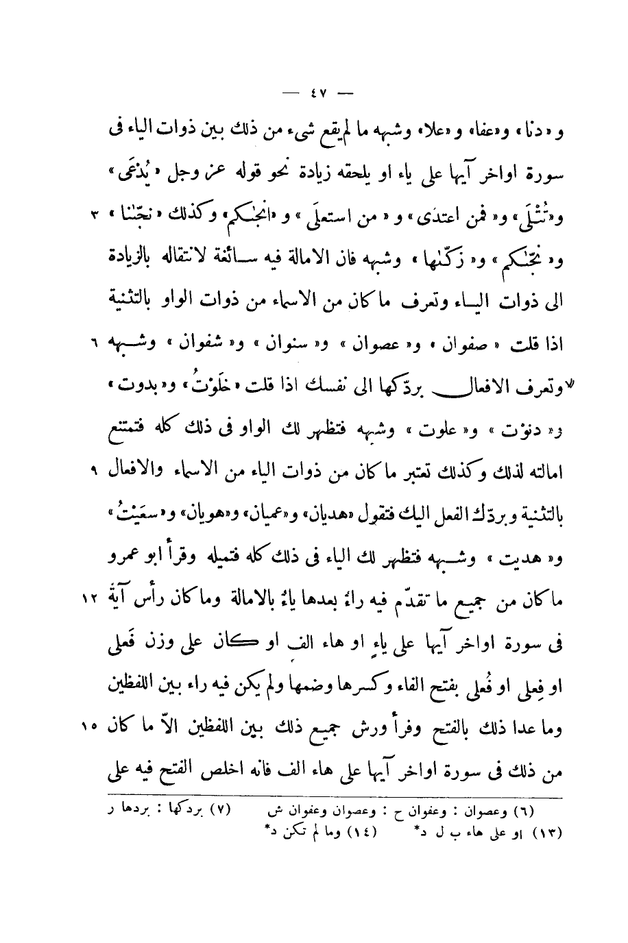 و {دنا} و {عَفا} و {علا} وَشبهه مَا لم يَقع شَيْء من ذَلِك بَين ذَوَات الْيَاء فِي سُورَة أَوَاخِر آيها على يَاء أَو يلْحقهُ زِيَادَة نَحْو قَوْله عز وَجل {يدعى} و {تتلى} و {فَمن اعْتدى} و {من استعلى} و {أنجاكم} وَكَذَلِكَ {نجانا} و {نجاكم} و {زكاها} وَشبهه فان الامالة فِيهِ سَائِغَة لانتقاله بِالزِّيَادَةِ الى ذَوَات الْيَاء وتعرف مَا كَانَ من الاسماء من ذَوَات الْوَاو بالتثنية اذا قلت {صَفْوَان} وعصوان وسنوان وشفوان وَشبهه وتعرف الْأَفْعَال بردكها الى نَفسك اذا قلت خلوت وبدوت ودنوت وعلوت وَشبهه فتظهر لَك الْوَاو فِي ذَلِك كُله فتمتنع امالته لذَلِك وَكَذَلِكَ تعْتَبر مَا كَانَ من ذَوَات الْيَاء من الاسماء والافعال بالتثنية وبردك الْفِعْل اليك فَتَقول هديان وعميان وهويان وسعيت وهديت وَشبهه فتظهر لَك الْيَاء فِي ذَلِك كُله فتميله وَقَرَأَ ابو عَمْرو مَا كَانَ من جَمِيع مَا تقدم فِيهِ رَاء بعْدهَا يَاء بالامالة وَمَا كَانَ رَأس آيَة فِي سُورَة اواخر آيها على يَاء اَوْ هَاء الف اَوْ كَانَ على وزن فعلى اَوْ فعلى اَوْ فعلى بِفَتْح الْفَاء وَكسرهَا وَضمّهَا وَلم يكن فِيهِ رَاء بَين اللَّفْظَيْنِ وَمَا عدا ذَلِك بِالْفَتْح وَقَرَأَ ورش جَمِيع ذَلِك بَين اللَّفْظَيْنِ الا مَا كَانَ من ذَلِك فِي سُورَة اواخر آيها على هَاء الف فانه اخلص الْفَتْح فِيهِ على
