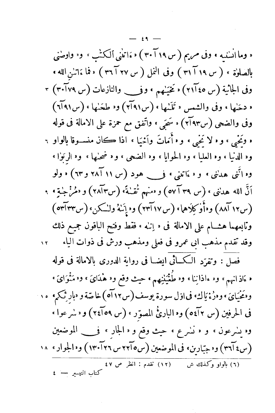 وَمَا انسنيه وَفِي مَرْيَم (س 19 آ 30) ءاتنى الْكتب واوصنى بالصلوة (س 19 آ 31) وَفِي النَّمْل (س 27 آ 36) فَمَا ءاتن الله وَفِي الجاثية (س 45 آ 21) محيهم وَفِي النازعات (س 79 آ 30) دحها وَفِي الشَّمْس تلها (س 91 آ 2) وطحها (س 91 آ 6) وَفِي الضُّحَى (س 93 آ 2) سجى وَاتفقَ مَعَ حَمْزَة على الامالة فِي قَوْله وَيحيى وَلَا يحيى وأمات واحيا اذا كَانَ منسوقا بِالْوَاو وَالدُّنْيَا والعليا والحوايا وَالضُّحَى وضحها والربوا واننى هدانى وءاتنى فِي هود (س 11 آ 28 و 63) وَلَو ان الله هدنى (س 39 آ 57) وَمِنْهُم تقة (س 3 آ 28) ومزجة (س 12 آ 88) وأو كِلَاهُمَا (س 17 آ 23) وَإنَّهُ وَلَكِن (س 33 آ 53) وتابعهما هِشَام على الامالة فِي انه فَقَط وَفتح الْبَاقُونَ جَمِيع ذَلِك وَقد تقدم مَذْهَب ابي عَمْرو فِي فعلى وَمذهب ورش فِي ذَوَات الْيَاء