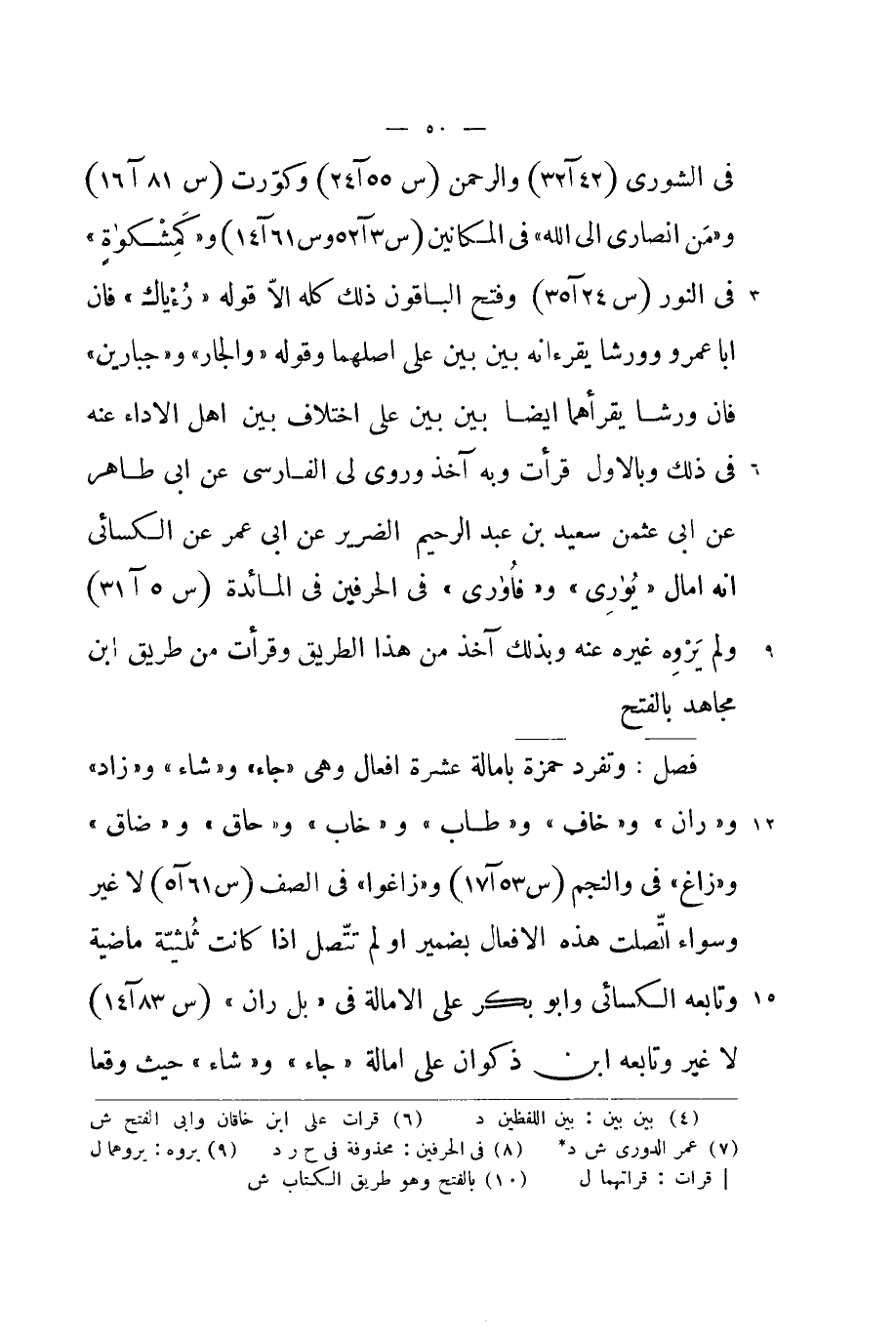 فِي الشورى والرحمن وكورت و {من أَنْصَارِي إِلَى الله} فِي المكانين و {كمشكاة} فِي النُّور وَفتح الْبَاقُونَ ذَلِك كُله الا قَوْله / رءياك / فان ابا عَمْرو وورشا يقرءانه بَين بَين على اصلهما وَقَوله {وَالْجَار} و {جبارين} فان ورشا يقرأهما ايضا بَين بَين على اخْتِلَاف بَين اهل الاداء عَنهُ فِي ذَلِك وبالاول قَرَأت وَبِه آخذ وروى لي الْفَارِسِي عَن ابي طَاهِر عَن ابي عُثْمَان سعيد بن عبد الرَّحِيم الضَّرِير عَن ابي عمر عَن الْكسَائي انه امال {يواري} و {فأواري} فِي الحرفين فِي الْمَائِدَة وَلم يروه غَيره عَنهُ وَبِذَلِك آخذ من هَذَا الطَّرِيق وقرأت من طَرِيق ابْن مُجَاهِد بِالْفَتْح