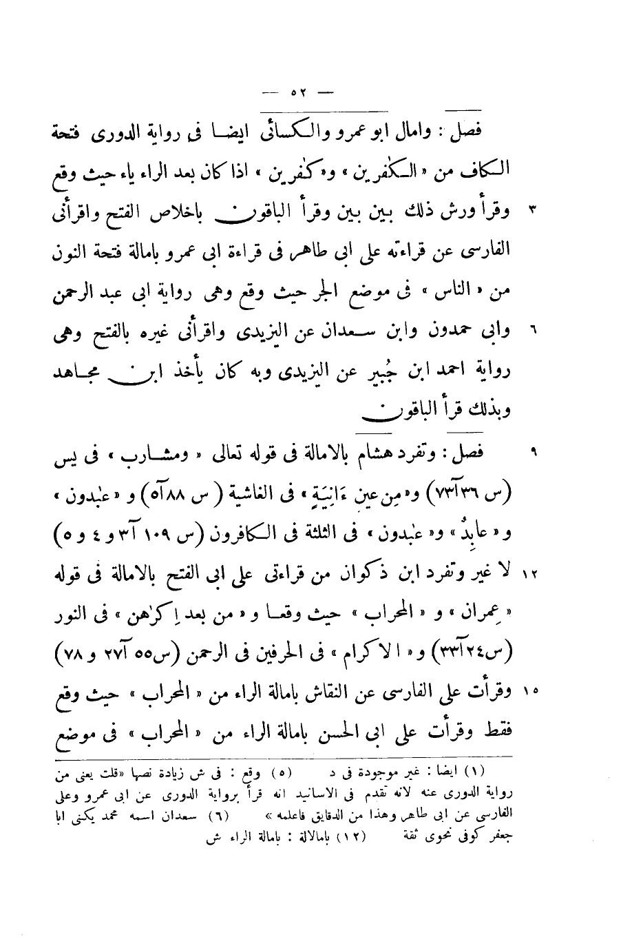 فصل وامال ابو عَمْرو وَالْكسَائِيّ ايضا فِي رِوَايَة الدوري فَتْحة الْكَاف من {الْكَافرين} و {كَافِرين} اذا كَانَ بعد الرَّاء يَاء حَيْثُ وَقع وَقَرَأَ ورش ذَلِك بَين بَين وَقَرَأَ الْبَاقُونَ باخلاص الْفَتْح واقرأني الْفَارِسِي عَن قِرَاءَته على ابي طَاهِر فِي قِرَاءَة ابي عَمْرو بامالة فَتْحة النُّون من {النَّاس} فِي مَوضِع الْجَرّ حَيْثُ وَقع وَهِي رِوَايَة ابي عبد الرَّحْمَن وابي حمدون وَابْن سَعْدَان عَن اليزيدي واقرأني غَيره بِالْفَتْح وَهِي رِوَايَة احْمَد بن جُبَير عَن اليزيدي وَبِه كَانَ يَأْخُذ ابْن مُجَاهِد وَبِذَلِك قَرَأَ الْبَاقُونَ