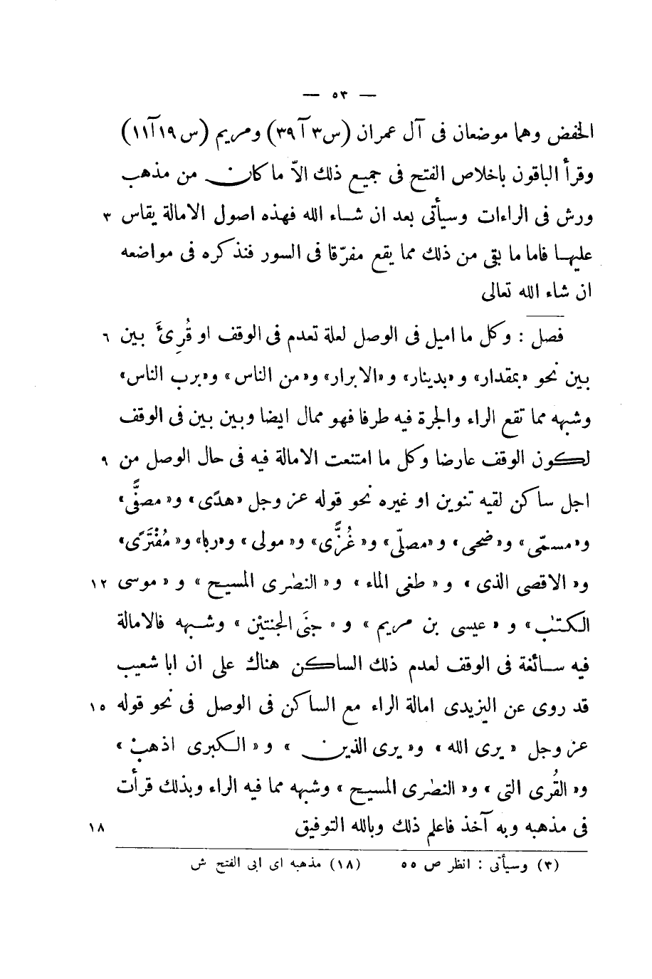 الْخَفْض وهما موضعان فِي آل عمرَان وَمَرْيَم وَقَرَأَ الْبَاقُونَ باخلاص الْفَتْح فِي جَمِيع ذَلِك الا مَا كَانَ من مَذْهَب ورش فِي الراءات وَسَيَأْتِي بعد ان شَاءَ الله فَهَذِهِ اصول الامالة يُقَاس عَلَيْهَا فاما مَا بَقِي من ذَلِك مِمَّا يَقع مفرقا فِي السُّور فنذكره فِي موَاضعه ان شَاءَ الله تَعَالَى
