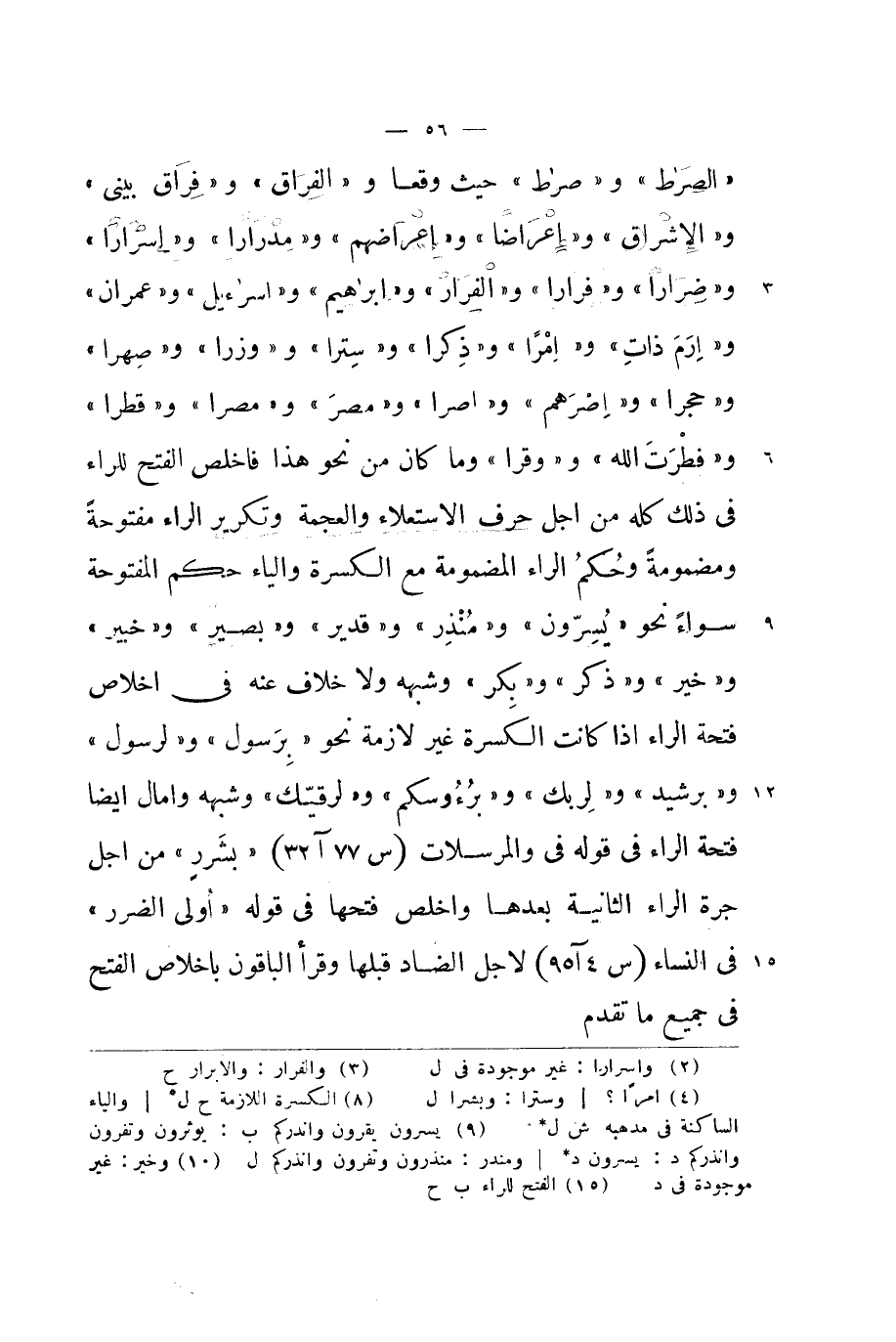 {الصِّرَاط} و {صِرَاط} حَيْثُ وَقعا و {الْفِرَاق} و {فِرَاق بيني} و {وَالْإِشْرَاق} و {إعْرَاضًا} و {إعراضهم} و {مدرارا} و {إسرارا} و {ضِرَارًا} و {فِرَارًا} و {الْفِرَار} و {إِبْرَاهِيم} و {إِسْرَائِيل} و {عمرَان} و {إرم ذَات} و {أمرا} و {ذكرا} و {سترا} و {وزرا} و {وصهرا} و {حجرا} و {إصرهم} و {إصرا} و {مصر} و {مصرا} و {قطرا} و / فطرت الله / و {وقرا} وَمَا كَانَ من نَحْو هَذَا فاخلص الْفَتْح للراء فِي ذَلِك كُله من اجل حرف الاستعلاء والعجمة وتكرير الرَّاء مَفْتُوحَة ومضمومة وَحكم الرَّاء المضمومة مَعَ الكسرة وَالْيَاء حكم الْمَفْتُوحَة سَوَاء نَحْو {يسرون} و {مُنْذر} و {قدير} و {بَصِير} و {خَبِير} و {خير} و {ذكر} و {بكر} وَشبهه وَلَا خلاف عَنهُ فِي اخلاص فَتْحة الرَّاء اذا كَانَت الكسرة غير لَازِمَة نَحْو {برَسُول} و {لرَسُول} و {برشيد} و {لِرَبِّك} و / برءوسكم / و {لرقيك} وَشبهه وامال ايضا فَتْحة الرَّاء فِي قَوْله فِي والمرسلات المرسلات {بشرر} من اجل جرة الرَّاء الثَّانِيَة بعْدهَا واخلص فتحهَا فِي قَوْله {أولي الضَّرَر} فِي النِّسَاء لاجل الضَّاد قبلهَا وَقَرَأَ الْبَاقُونَ باخلاص الْفَتْح فِي جَمِيع مَا تقدم