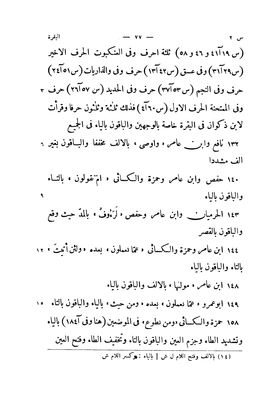 ثَلَاثَة احرف وَفِي العنكبوت الْحَرْف الاخير وَفِي عسق حرف وَفِي والذاريات حرف وَفِي النَّجْم حرف وَفِي الْحَدِيد حرف وَفِي الممتحنة الْحَرْف الاول فَذَلِك ثَلَاثَة وَثَلَاثُونَ حرفا وقرأت لِابْنِ ذكْوَان فِي الْبَقَرَة خَاصَّة بِالْوَجْهَيْنِ وَالْبَاقُونَ بِالْيَاءِ فِي الْجَمِيع