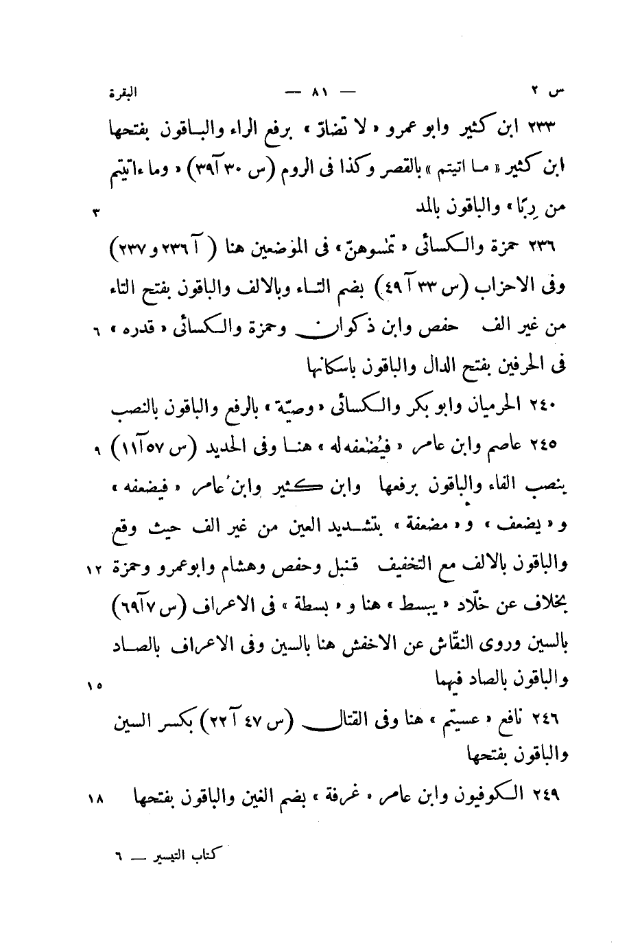 عَاصِم وَابْن عَامر {فيضاعفه لَهُ} هُنَا وَفِي الْحَدِيد بِنصب الْفَاء وَالْبَاقُونَ برفعها وَابْن كثير وَابْن عَامر / فيضعفه / و / يضعف / و / مضعفة / بتَشْديد الْعين من غير الف حَيْثُ وَقع وَالْبَاقُونَ بالالف مَعَ التَّخْفِيف قنبل وَحَفْص وَهِشَام وابو عَمْرو وَحَمْزَة بِخِلَاف عَن خَلاد {يبسط} هُنَا و {بسطة} فِي الاعراف بِالسِّين وروى النقاش عَن الاخفش هُنَا بِالسِّين وَفِي الاعراف بالصَّاد وَالْبَاقُونَ بالصَّاد فيهمَا