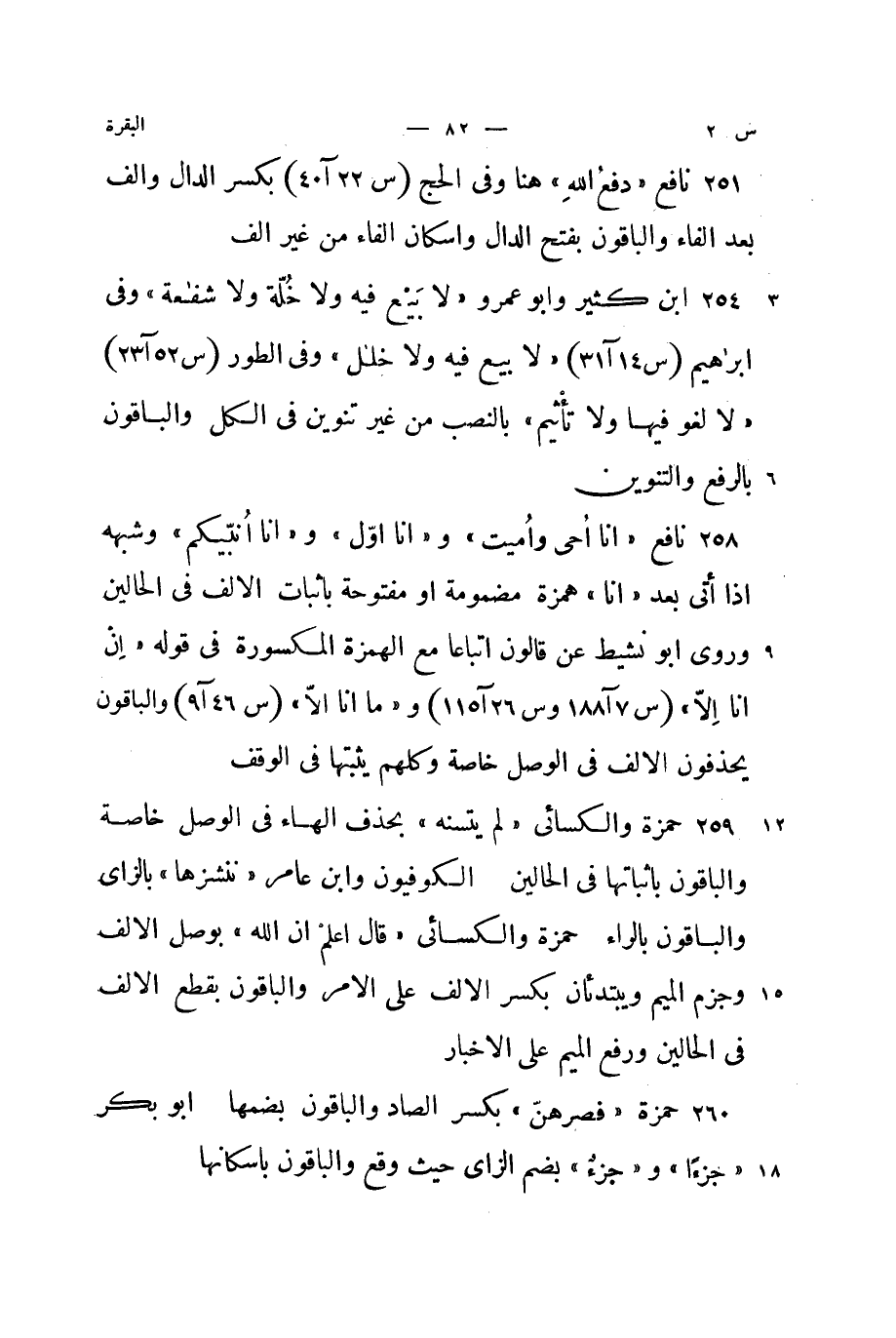 حَمْزَة وَالْكسَائِيّ {لم يتسنه} بِحَذْف الْهَاء فِي الْوَصْل خَاصَّة وَالْبَاقُونَ باثباتها فِي الْحَالين الْكُوفِيُّونَ وَابْن عَامر {ننشزها} بالزاي وَالْبَاقُونَ بالراء حَمْزَة وَالْكسَائِيّ {قَالَ أعلم أَن الله} بوصل الالف وَجزم الْمِيم ويبتدئان بِكَسْر الالف على الامر وَالْبَاقُونَ بِقطع الالف فِي الْحَالين وَرفع الْمِيم على الاخبار
