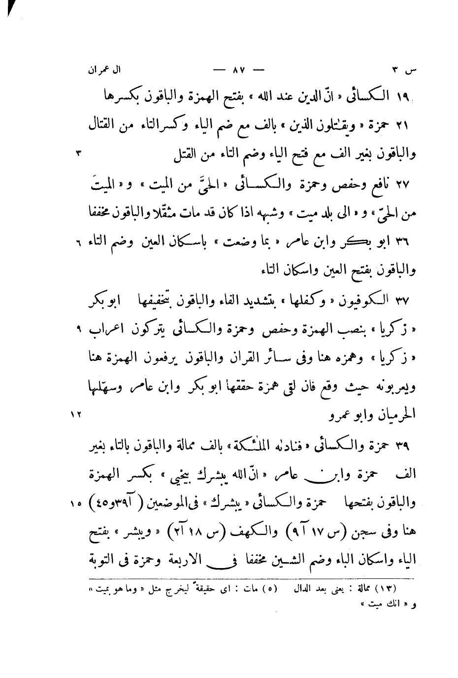 حَمْزَة وَالْكسَائِيّ / فناداه الْمَلَائِكَة / بالف ممالة وَالْبَاقُونَ بِالتَّاءِ بِغَيْر الف حَمْزَة وَابْن عَامر {أَن الله يبشرك بِيَحْيَى} بِكَسْر الْهمزَة وَالْبَاقُونَ بِفَتْحِهَا حَمْزَة وَالْكسَائِيّ {يبشرك} فِي الْمَوْضِعَيْنِ هُنَا وَفِي سُبْحَانَ والكهف {ويبشر} بِفَتْح الْيَاء واسكان الْبَاء وَضم الشين مخففا فِي الاربعة وَحَمْزَة فِي التَّوْبَة