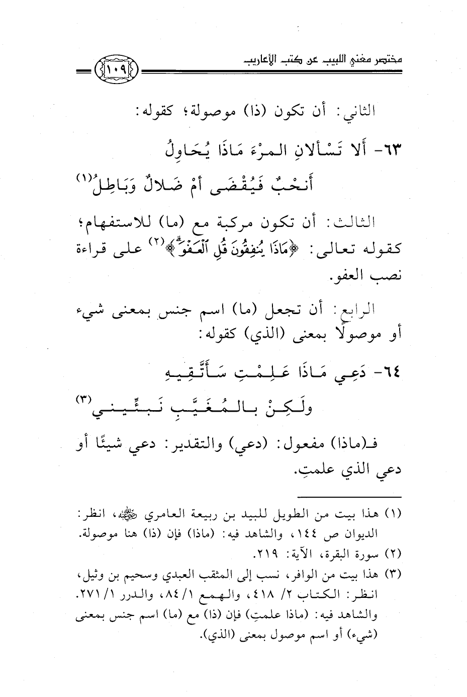 1 هذا بيت من الطويل، للبيد بن ربيعة العامري رضي الله عنه، انظر: الديوان ص144، والكتاب 2/417 وشرح التسهيل 1/159، وأوضح المسالك 1/159، والأشموني 1/120، واللسان مادة: حول. الشاهد فيه: ماذا فإن ذا هنا موصولة.
