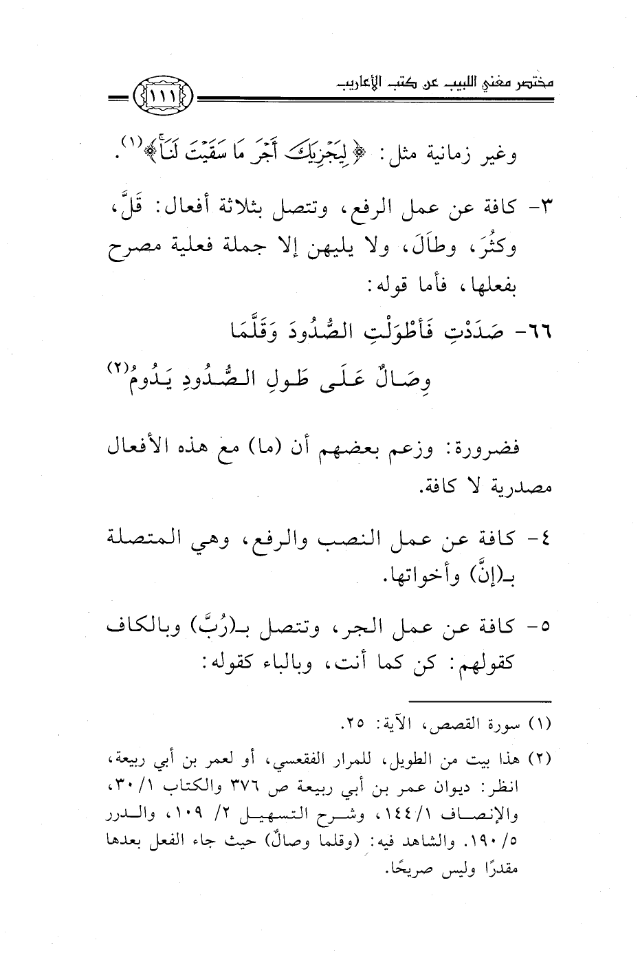 3- كافة عن عمل الرفع، وتتصل بثلاثة أفعال؛ قل، وكثر، وطال، ولا يليهن إلا جملة فعلية مصرح بفعلها، فأما قوله: