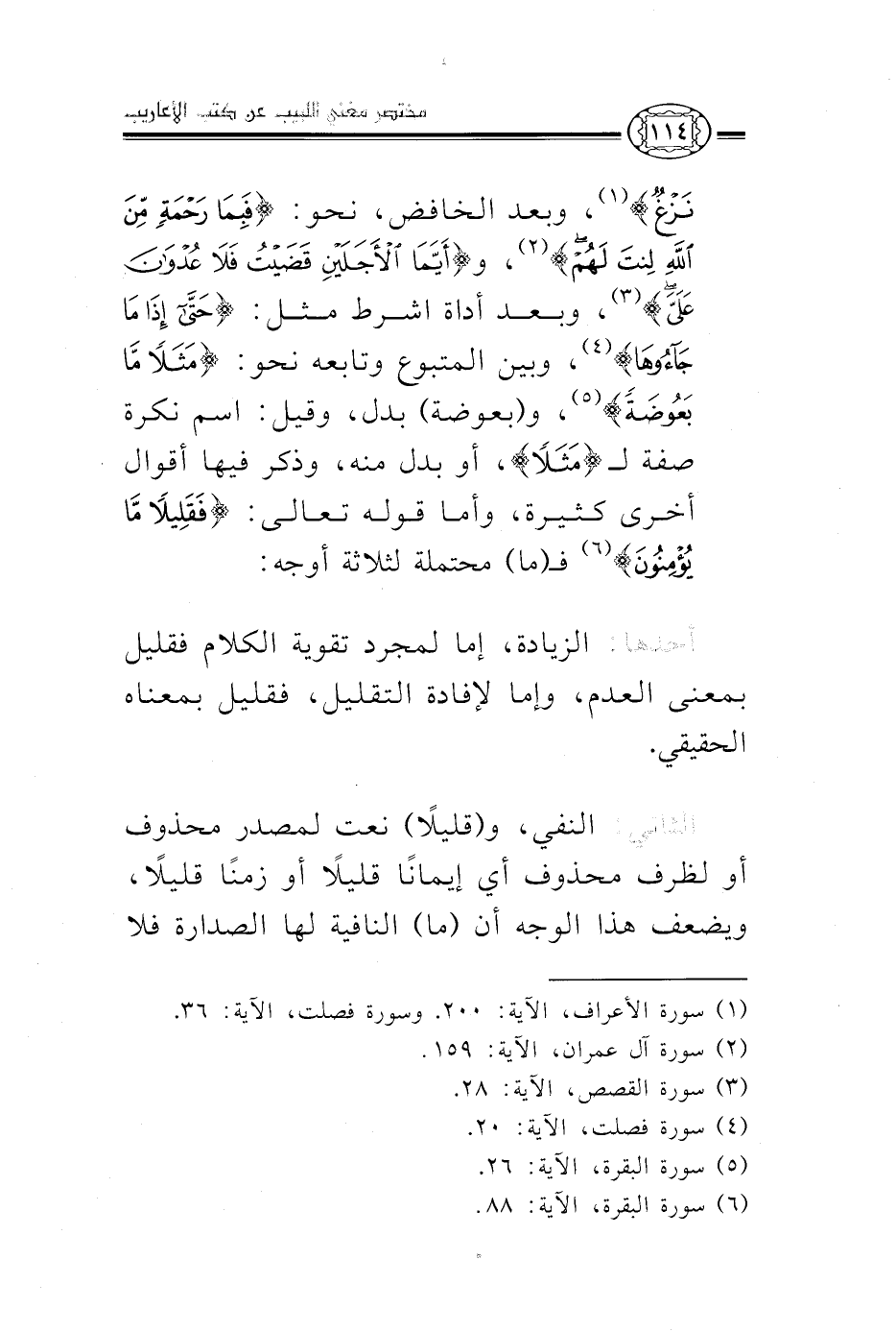 نَزْغٌ} 1وبعد الخافض، نحو: {فَبِمَا رَحْمَةٍ مِنَ اللَّهِ لِنْتَ لَهُمْ} 2، {أَيَّمَا الْأَجَلَيْنِ قَضَيْتُ فَلا عُدْوَانَ عَلَيَّ} 3، وبعد أداة الشرط مثل: {حَتَّى إِذَا مَا جَاءُوهَا} 4، وبين المتبوع وتابعه نحو: {مَثَلاً مَا بَعُوضَةً} 5 وبعوضة بدل، وقيل اسم نكرة صفة لمثلا، أو بدل منه، وذكر فيها أقوال أخرى كثيرة، وأما قوله تعالى: {فَقَلِيلاً مَا يُؤْمِنُونَ} 6 فما محتملة لثلاثة أوجه: