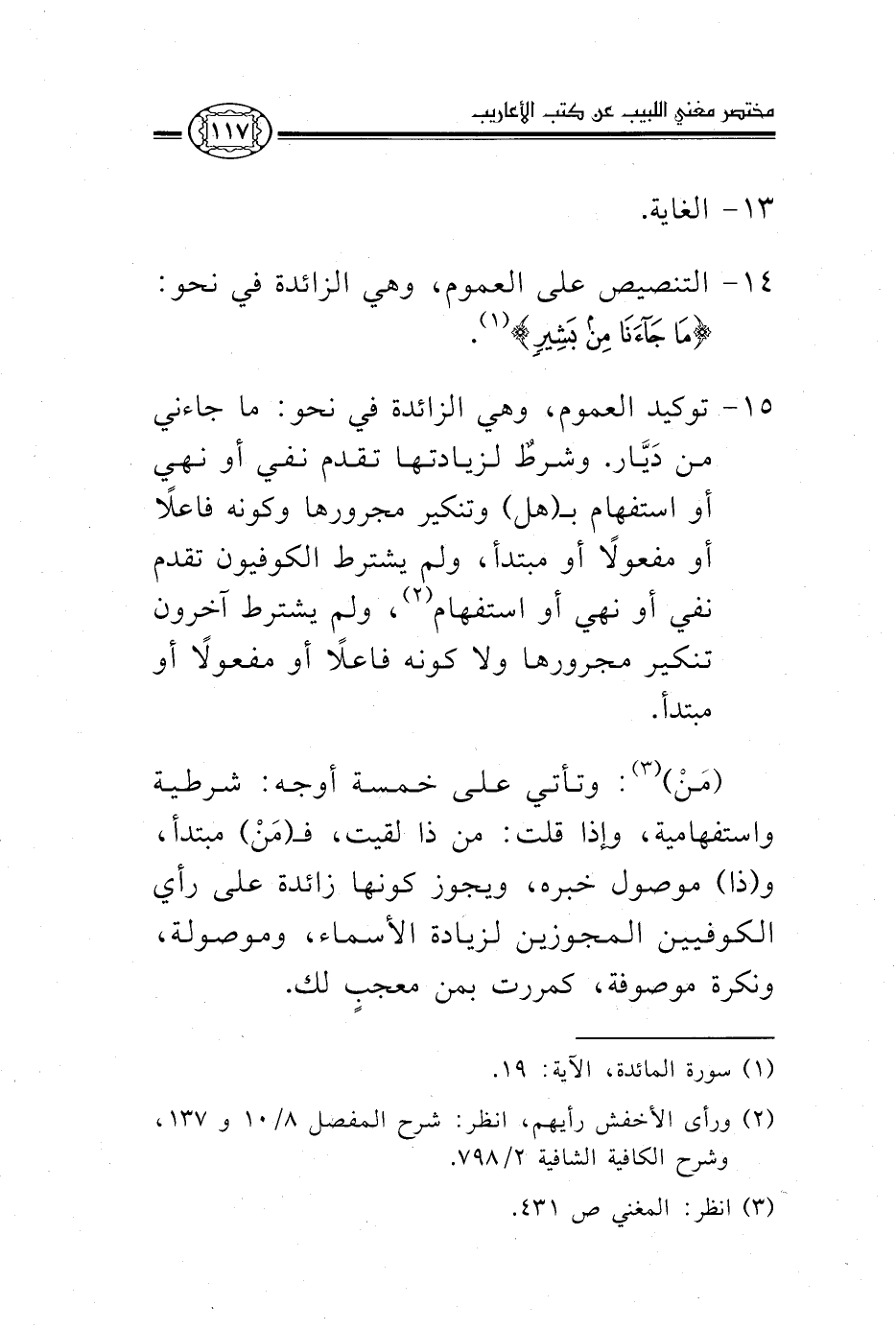 14- التنصيص على العموم، وهي الزائدة في نحو: {مَا جَاءَنَا مِنْ بَشِيرٍ} 1.