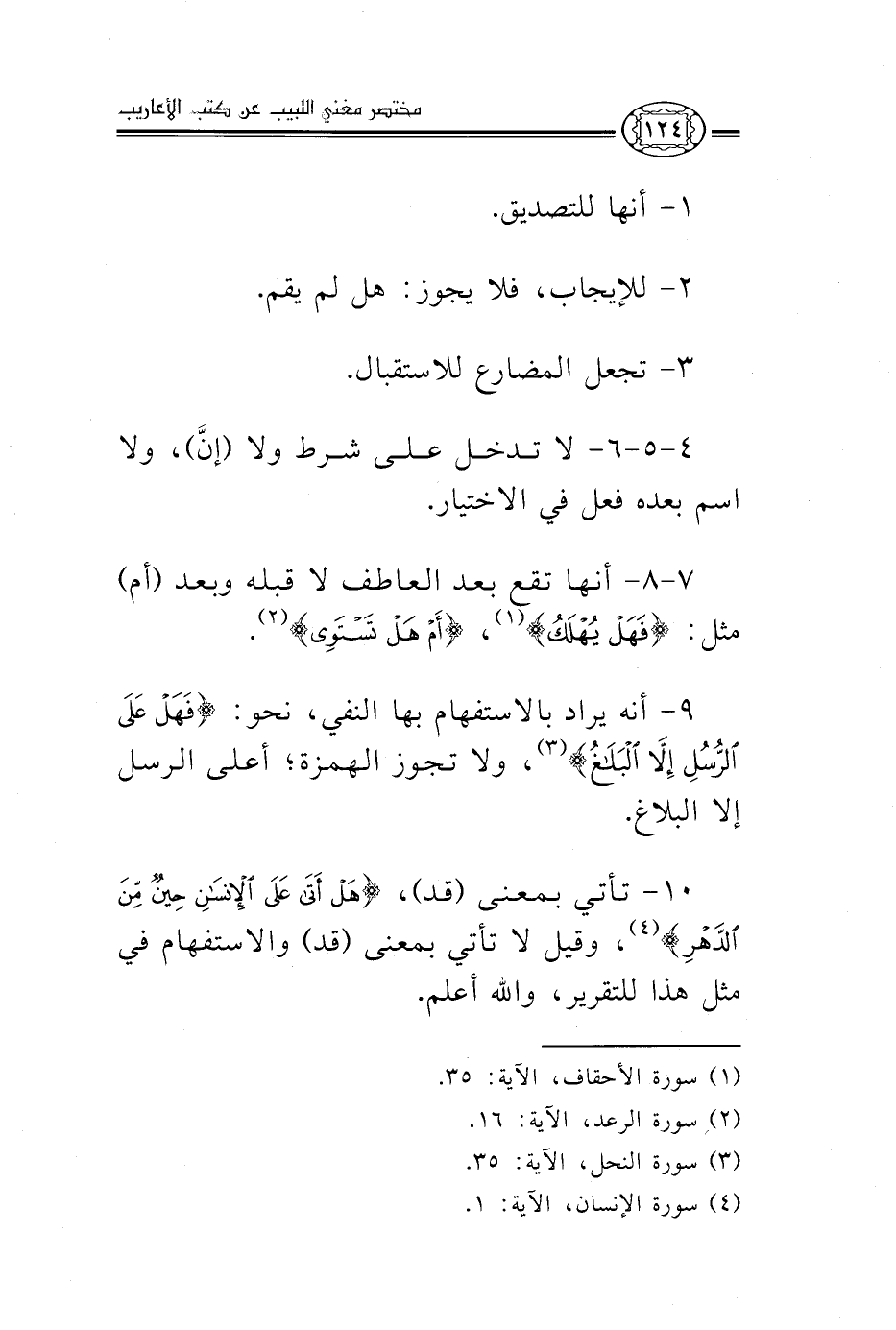 9- أنه يراد بالاستفهام بها النفي، نحو: {فَهَلْ عَلَى الرُّسُلِ إِلَّا الْبَلاغُ الْمُبِينُ} 3، ولا تجوز الهمزة؛ أعلى الرسل إلا البلاغ.