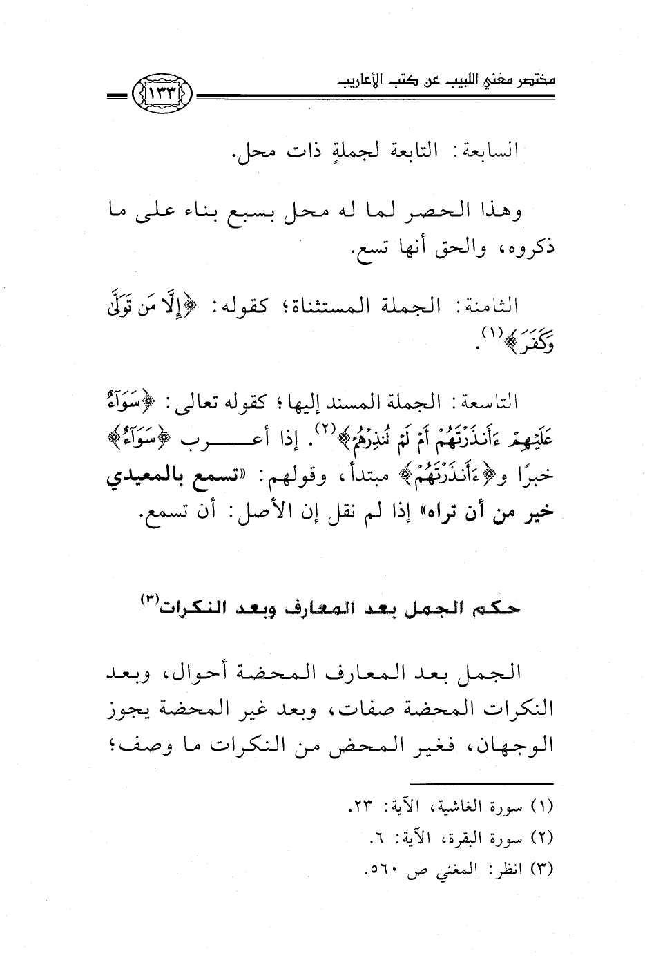 التاسعة: الجملة المسند إليها، كقوله تعالى: {سَوَاءٌ عَلَيْهِمْ أَأَنْذَرْتَهُمْ أَمْ لَمْ تُنْذِرْهُمْ} 2 إذا أعرب {سَوَاءٌ} خبرا و {أَأَنْذَرْتَهُمْ} مبتدأ، وقولهم: "تسمع بالمعيدي خير من أن تراه" إذا لم نقل إن الأصل: أن تسمع.