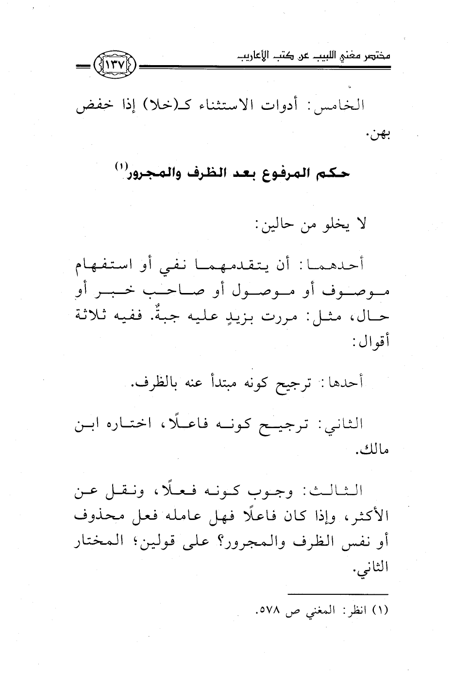 الثالث: وجوب كونه فاعلا، ونقل عن الأكثر، وإذا كان فاعلا فهل عامله فعل محذوف أو نفس الظرف والمجرور؟ على قولين؛ المختار الثاني.