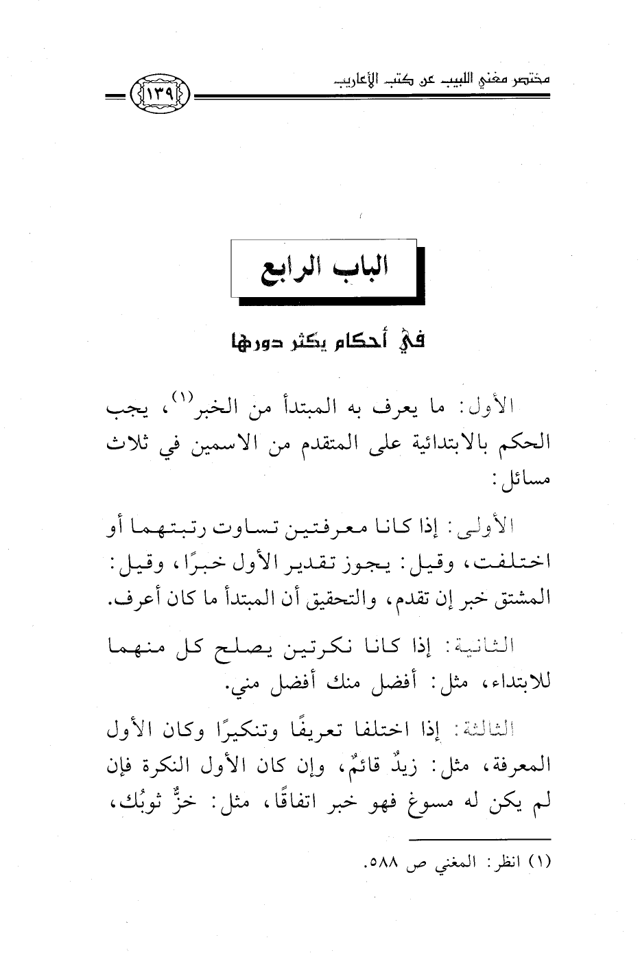 الأول: ما يعرف به المبتدأ من الخبر1، يجب الحكم بالابتدائية على المتقدم من الاسمين في ثلاث مسائل: