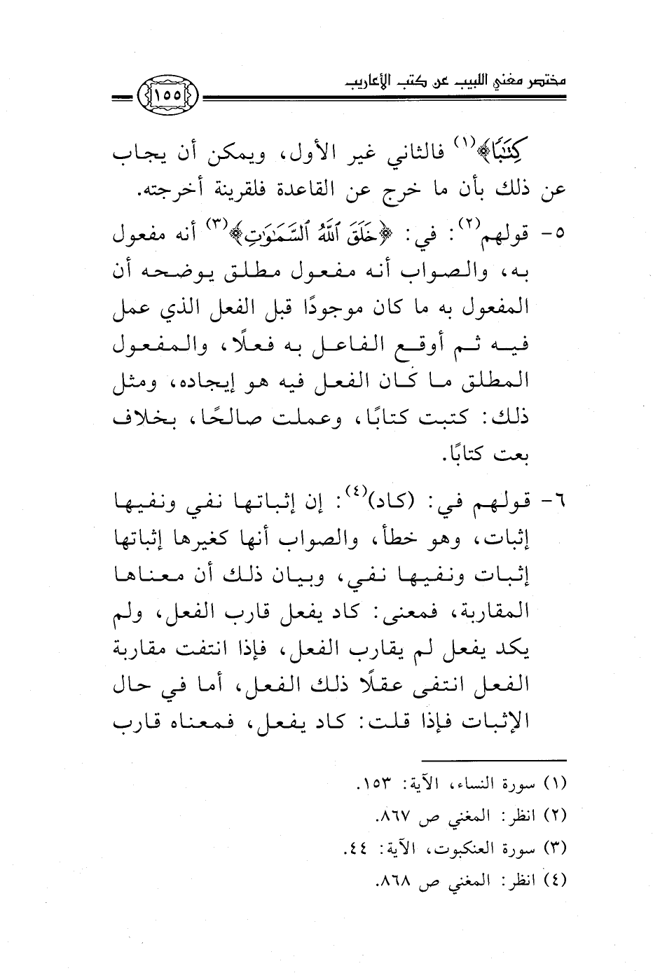 5- قولهم2 في: {خَلَقَ اللَّهُ السَّمَاوَاتِ} 3 أنه مفعول به، والصواب أنه مفعول مطلق يوضحه أن المفعول به ما كان موجودا قبل الفعل الذي عمل فيه ثم أوقع الفاعل به فعلا، والمفعول المطلق ما كان الفعل فيه هو إيجاده، ومثل ذلك: كتبت كتابا، وعملت صالحا، بخلاف بعت كتابا.