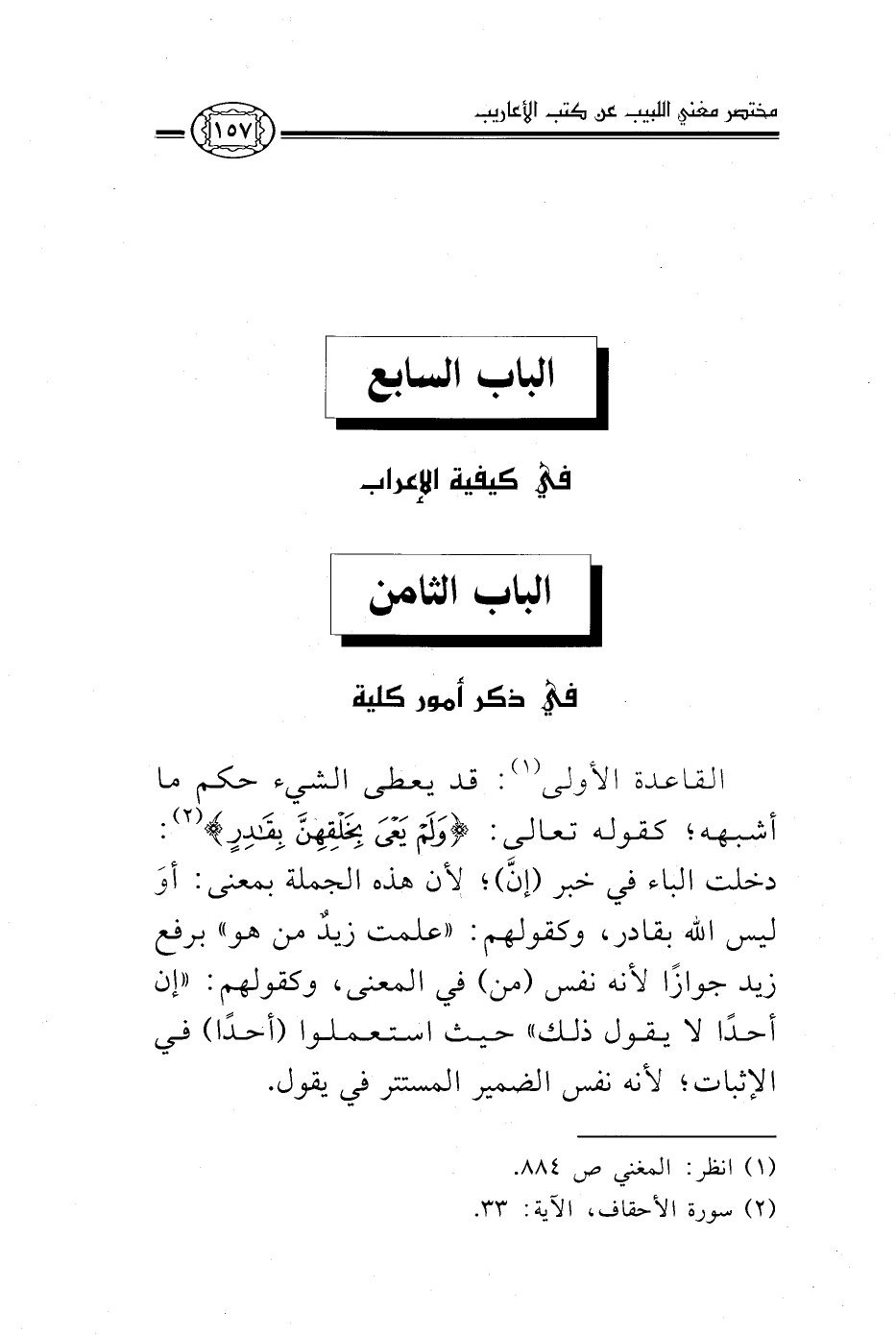 القاعدة الأولى1: قد يعطى الشيء حكم ما أشبهه كقوله تعالى: {وَلَمْ يَعْيَ بِخَلْقِهِنَّ بِقَادِرٍ} 2 دخلت الباء في خبر "إن"؛ لأن هذه الجملة بمعنى: أوليس الله بقادر، وكقولهم: "علمت زيد من هو" برفع زيد جوازا لأنه نفس من المعنى، وكقولهم: "إن أحدا لا يقول ذلك" حيث استعملوا أحدا في الإثبات لأنه نفس الضمير المستتر في يقول.