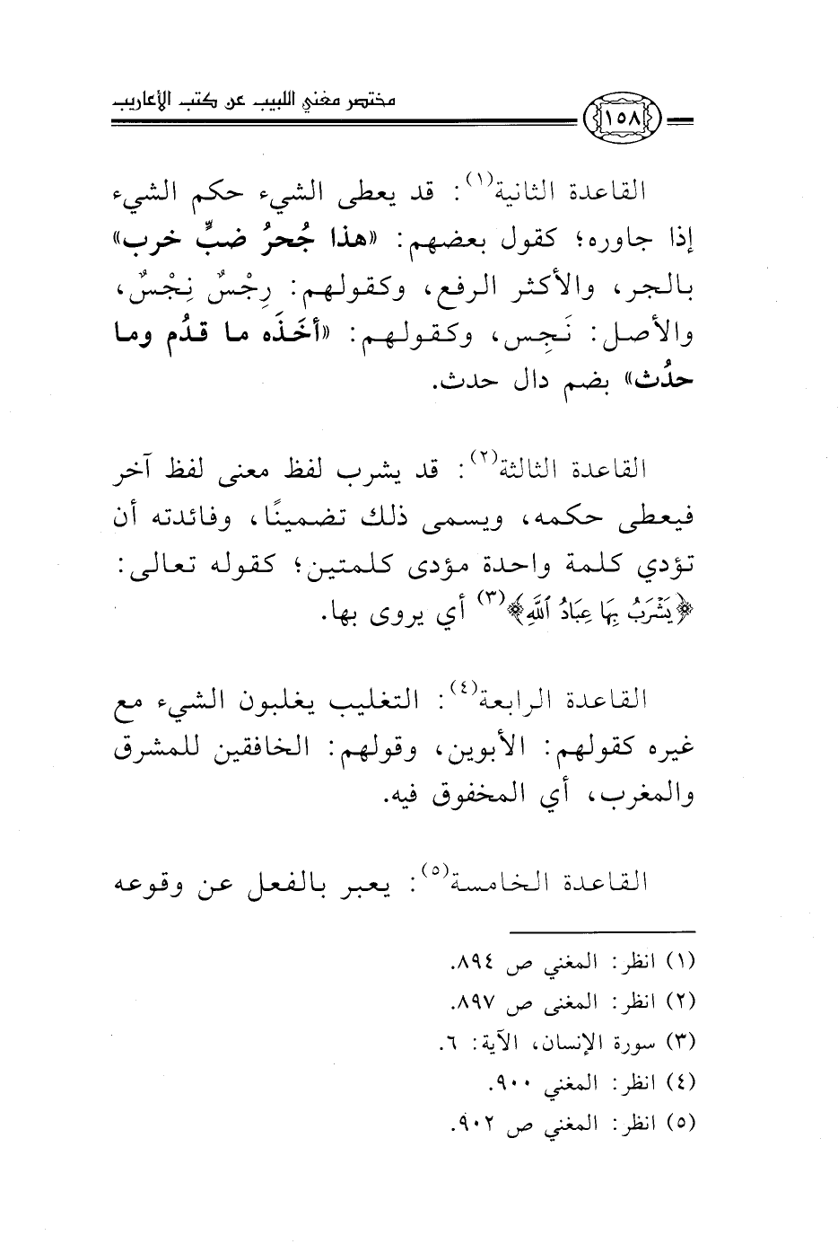 قد يعطى الشيء حكم الشيء إذا جاوره كقول بعضهم: "هذا جحر ضب خرب" بالجر، والأكثر الرفع، وكقولهم: رجس نجس، والأصل: نجس، وكقولهم: "أخذه ما قدم وما حدث" بضم دال حدث.